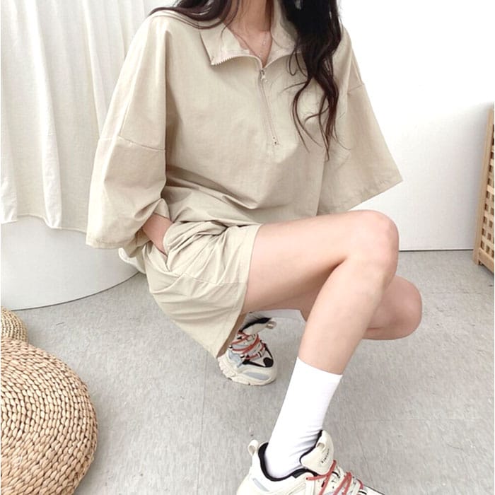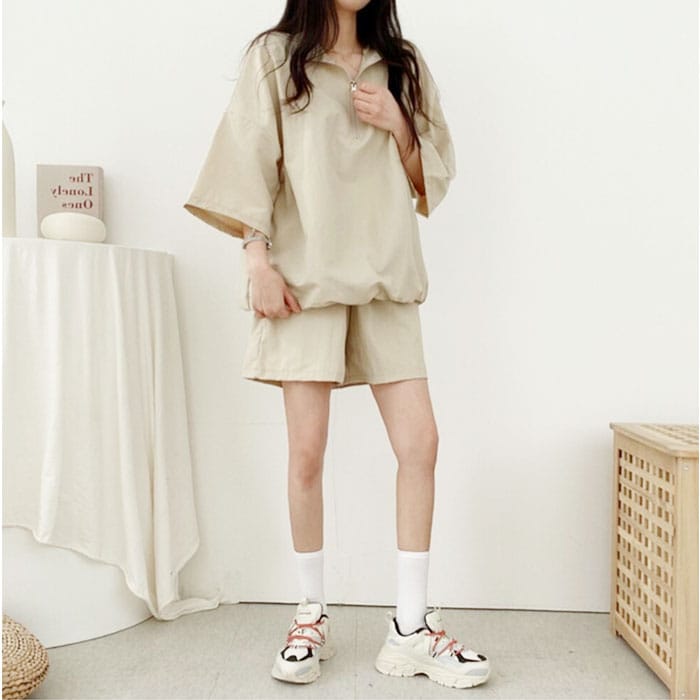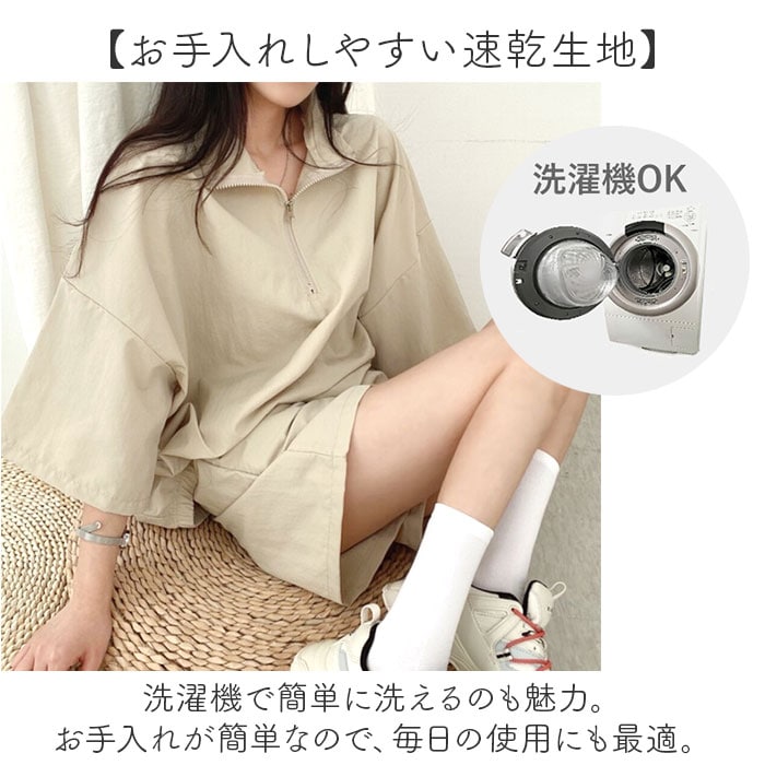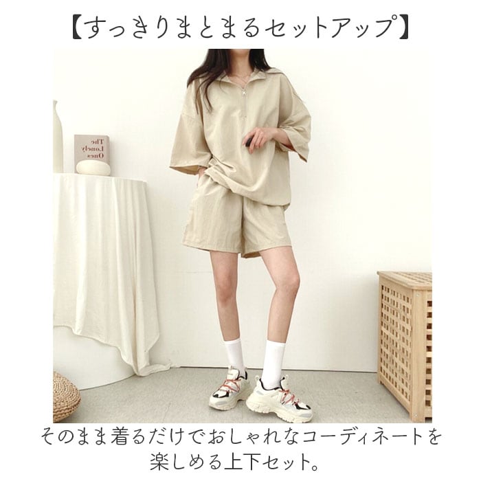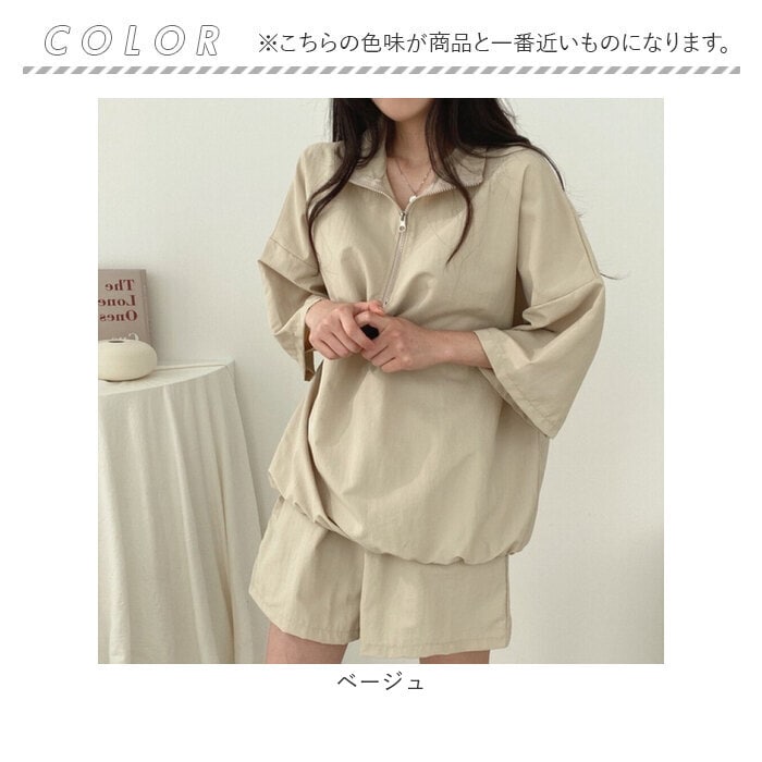 ハーフジップ ハーフパンツ セットアップ mmsetup14【ベージュ】【Lサイズ】
