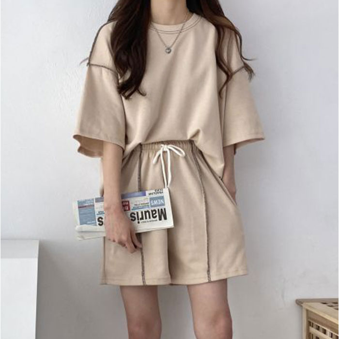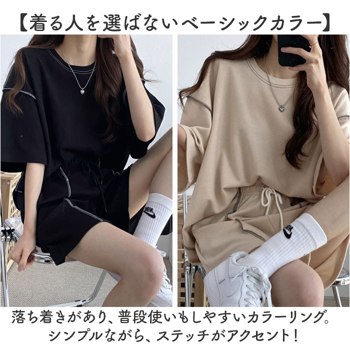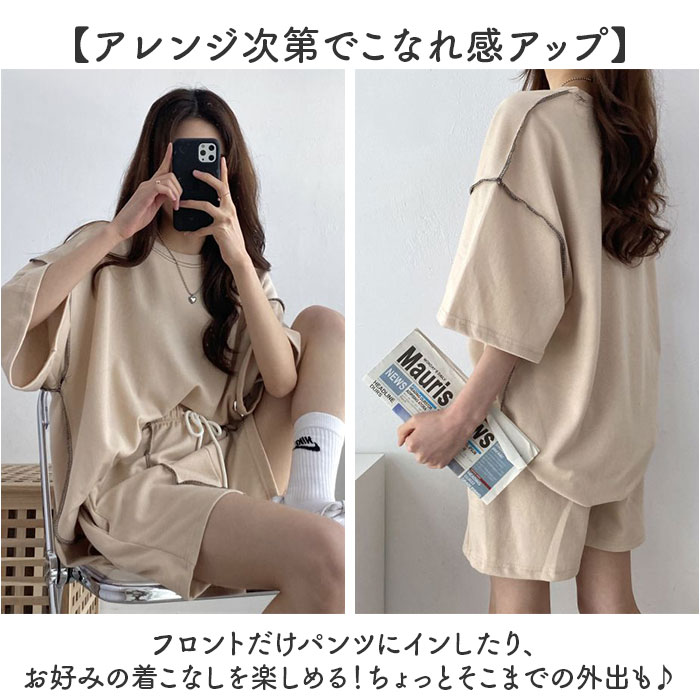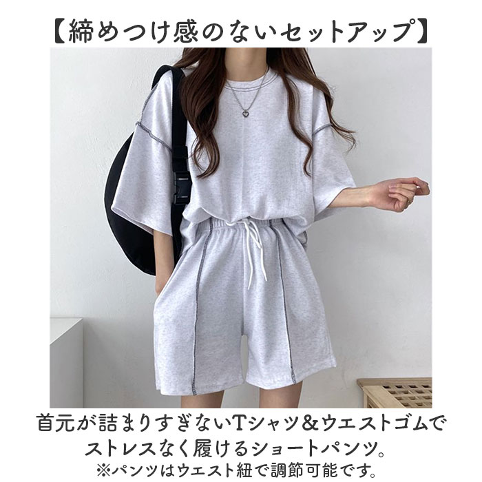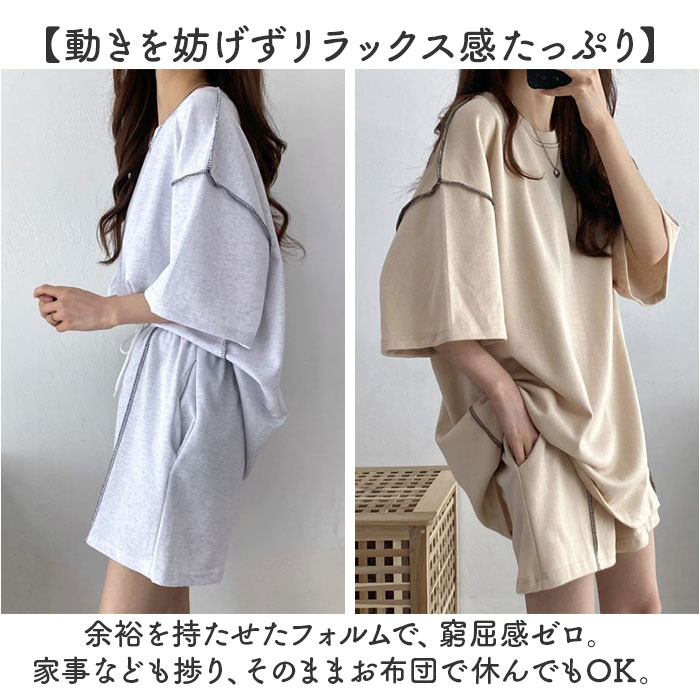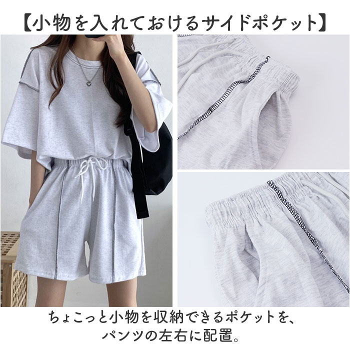 | 商品説明 | 【お家時間を快適に過ごせるアイテム】サッと着られて、ゆったり感が心地よい!Tシャツ&ショートパンツのセットアップ♪【締めつけ感のないセットアップ】首元が詰まりすぎないTシャツ&ウエストゴムでストレスなく履けるショートパンツ。(※)パンツはウエスト紐で調節可能です。【動きを妨げずリラックス感たっぷり】余裕を持たせたフォルムで、窮屈感ゼロ。家事なども捗り、そのままお布団で休んでもOK。【アレンジ次第でこなれ感アップ】フロントだけパンツにインしたり、お好みの着こなしを楽しめる!ちょっとそこまでの外出も♪【小物を入れておけるサイドポケット】ちょこっと小物を収納できるポケットを、パンツの左右に配置。【着る人を選ばないベーシックカラー】落ち着きがあり、普段使いもしやすいカラーリング。シンプルながら、ステッチがアクセント! |