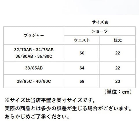 | サイズ | [レディース] 【ブラジャー】 ・32/70AB ・34/75AB ・36/80AB ・38/85AB ・36/80C ・38/85C ・40/90C ※サイズはメーカー公表サイズです。実際の商品とは多少の誤差が生じる場合がございます。あらかじめご了承ください。 【ショーツ】 ※ショーツの対応サイズについて詳細は、商品画像の中にあるサイズ表をご覧くださいませ。 |