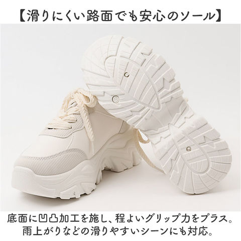 | 商品説明 | 【トレンド感のあるスタイルを演出】足元をおしゃれに盛れて、履きやすさも抜群♪厚底タイプの「ダッドスニーカー」が新登場。【ボリュームのあるダッドスニーカー】お父さんが履いていそうなスニーカーを、現代風にアレンジ。レトロ感の残るデザインが魅力◎【自然なスタイルアップで足元すらり】履くだけで身長がアップする厚底仕様☆存在感が増し、足元をキレイ魅せ!【フィット感を高めるシューレース】紐の結び具合で多少のサイズ調節が可能。シューズと足が一体化するような着用感。(※)バックにプルタブ付きです。【程よいクッション性で負担を軽減】足裏に当たる部分はソフトな質感。インソールは取り外してお手入れできて、衛生的◎【ホールド力もあり歩行をサポート】足首もしっかり支え、安定性をキープ。長時間履いても疲れにくいのが嬉しい!【滑りにくい路面でも安心のソール】底面に凹凸加工を施し、程よいグリップ力をプラス。雨上がりなどの滑りやすいシーンにも対応。【お気に入りを選べるカラー】コーデを選ばず合わせやすい、モノトーンカラー。サイドデザインや靴紐がアクセント! |