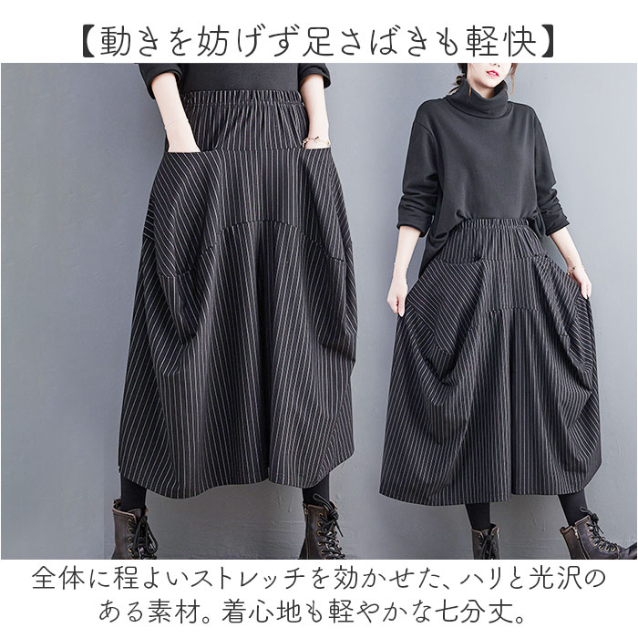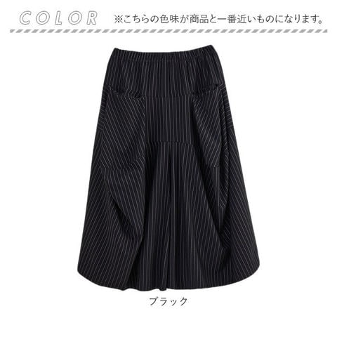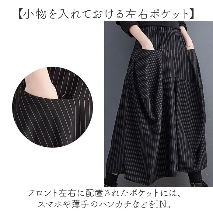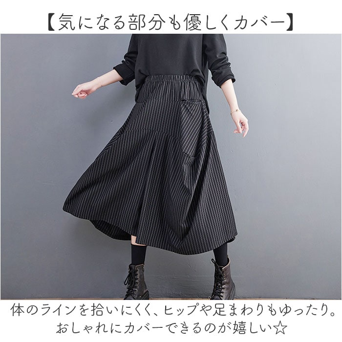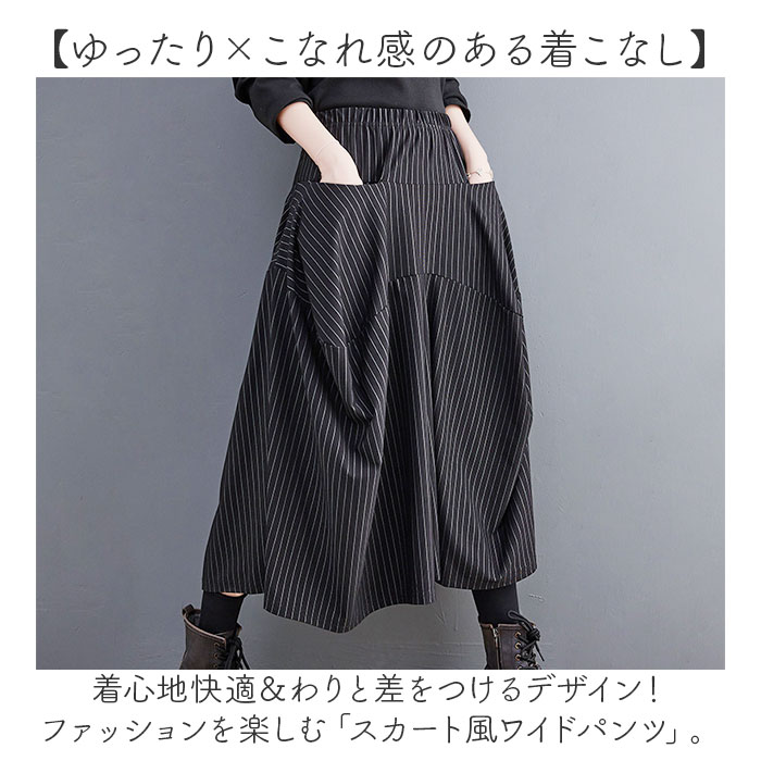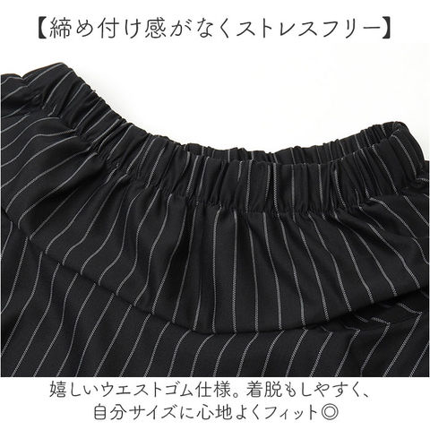 スカート風ワイドパンツ ストライプ柄 ウエストゴム【ブラック】