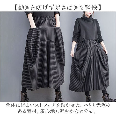 | 商品説明 | 【ゆったり×こなれ感のある着こなし】着心地快適&わりと差をつけるデザイン!ファッションを楽しむ「スカート風ワイドパンツ」。【絶妙フォルムと個性の光るデザイン】股上たっぷり、スカートのようなシルエット。ボリュームをプラスしたデザイン性の高さが魅力♪【気になる部分も優しくカバー】体のラインを拾いにくく、ヒップや足まわりもゆったり。おしゃれにカバーできるのが嬉しい☆【動きを妨げず足さばきも軽快】全体に程よいストレッチを効かせた、ハリと光沢のある素材。着心地も軽やかな七分丈。【締め付け感がなくストレスフリー】嬉しいウエストゴム仕様。着脱もしやすく、自分サイズに心地よくフィット◎【小物を入れておける左右ポケット】フロント左右に配置されたポケットには、スマホや薄手のハンカチなどをIN。【コーデの幅が広がる万能アイテム】オーバーサイズのスウェットなどと合わせてルーズに。タイトなトップスも相性抜群。【シワになりにくく旅行などにも】折りたたんだり、座った時もシワになりにくい素材。旅行やレジャーにもおすすめ。【モードなストライプスデザイン】大人な印象を演出する、ブラックカラー&ストライプ。存在感もプラスし、コーデの主役に☆ |