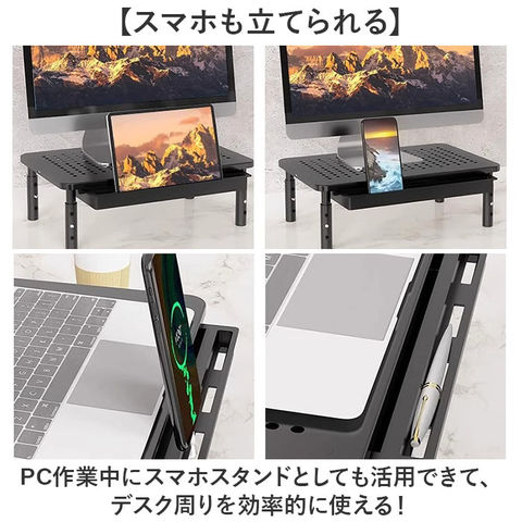 | 商品説明 | 【デスクを快適に整える】高さ調整可能で引き出し付き、省スペースなモニター台。【高さ3段階で調整自在】3段階調節で、自分の姿勢に合わせて画面の高さを選べる◎【引き出しで整理整頓】台の下に引き出しが付いているから、文房具やケーブル類をすっきり収納♪【放熱しやすい穴あき】天板に通気穴があるから、モニターやノートPCの熱を逃がして快適に使い続けられる〇【スマホも立てられる】PC作業中にスマホスタンドとしても活用できて、デスク周りを効率的に使える!【アルミ合金の質感】脚を回して取り付けるだけで簡単に組み立てられる。 |