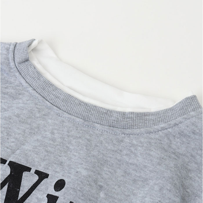 重ね着風トップス ロゴ付き 裏起毛【グレー】【Lサイズ】