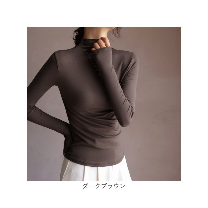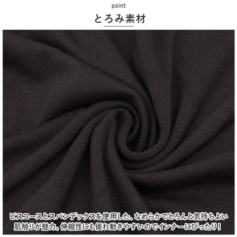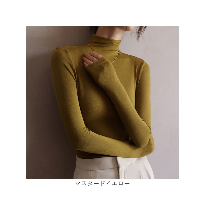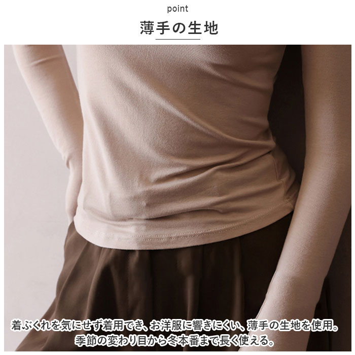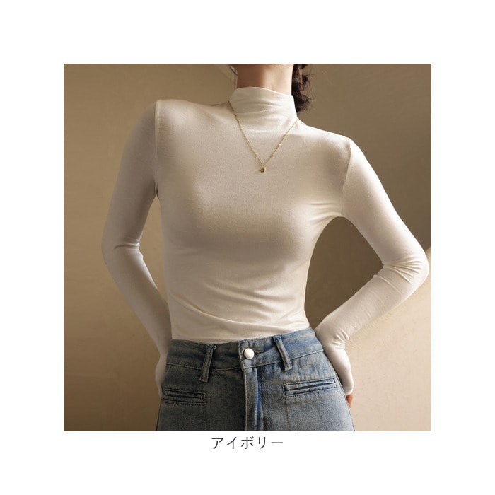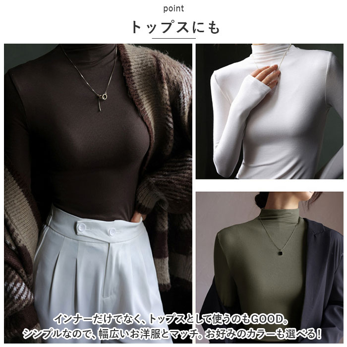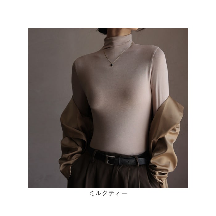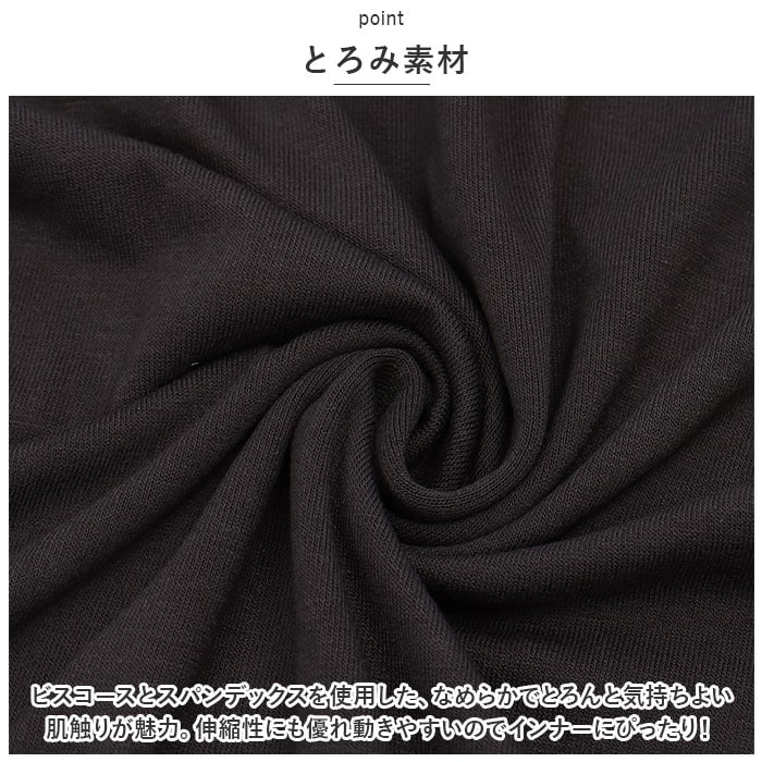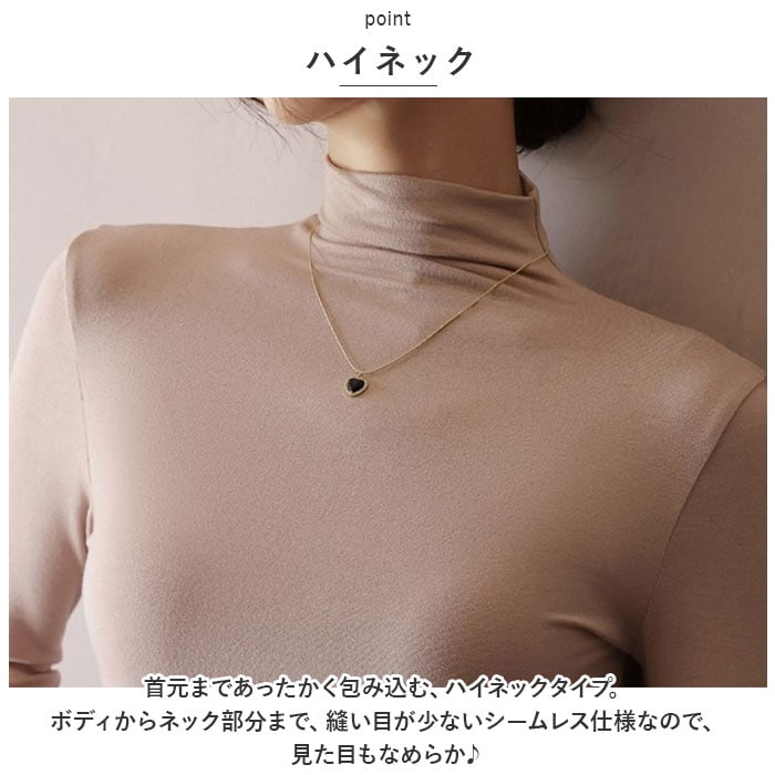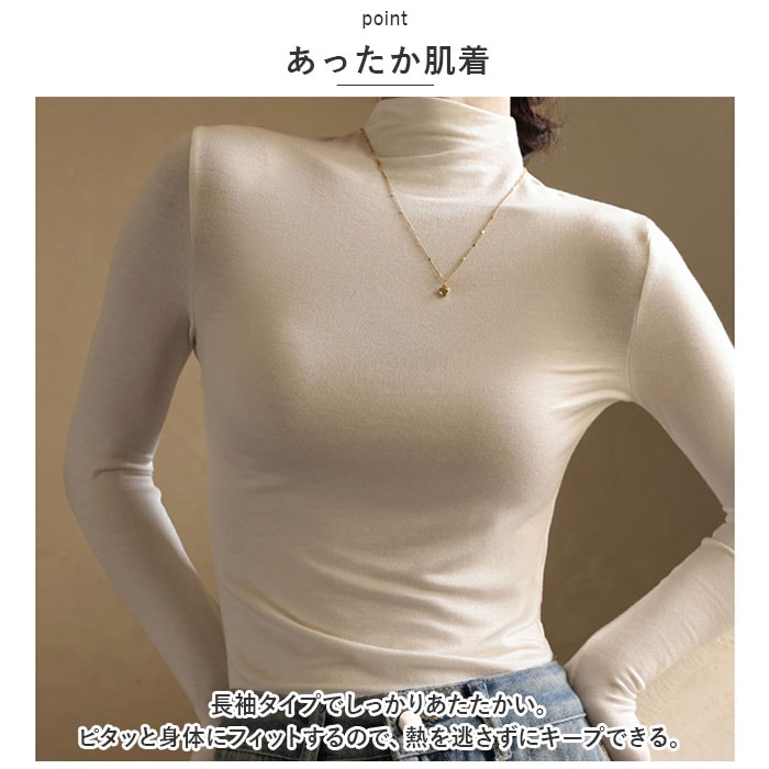 | 商品説明 | とろみ素材が気持ちいい♪ ハイネックインナー が登場。【とろみ素材】ビスコースとスパンデックスを使用した、なめらかでとろんと気持ちよい肌触りが魅力。伸縮性にも優れ動きやすいのでインナーにぴったり!【ハイネック】首元まであったかく包み込む、ハイネックタイプ。ボディからネック部分まで、縫い目が少ないシームレス仕様なので、見た目もなめらか♪【薄手の生地】着ぶくれを気にせず着用でき、お洋服に響きにくい、薄手の生地を使用。季節の変わり目から冬本番まで長く使える。【あったか肌着】長袖タイプでしっかりあたたかい。ピタッと身体にフィットするので、熱を逃さずにキープできる。【トップスにも】インナーだけでなく、トップスとして使うのもGOOD。シンプルなので、幅広いお洋服とマッチ。お好みのカラーも選べる! |