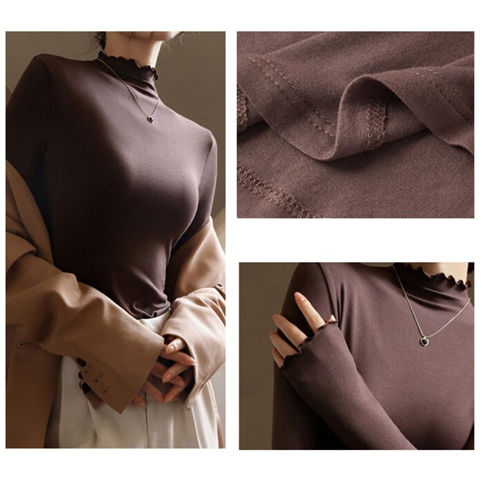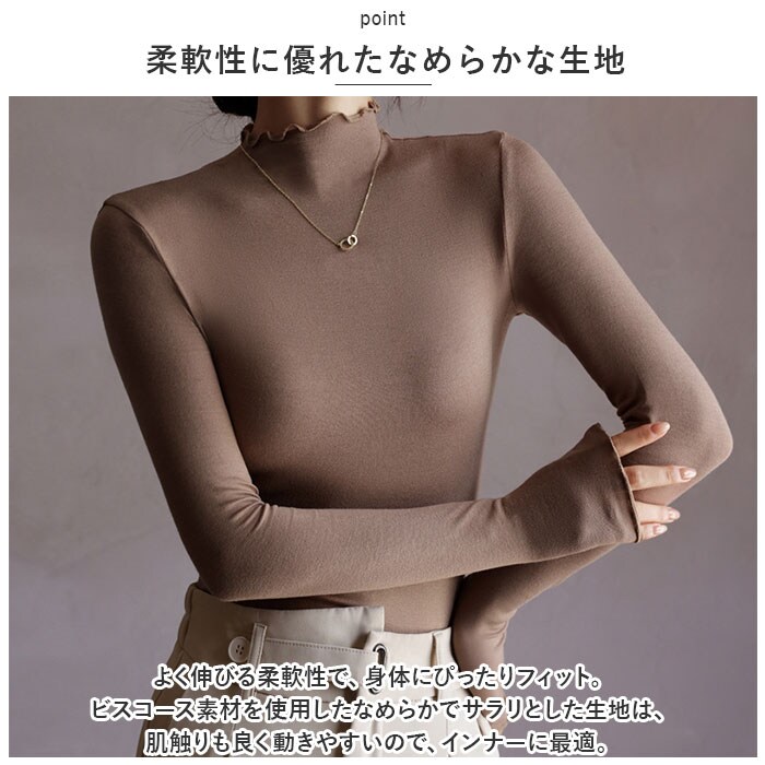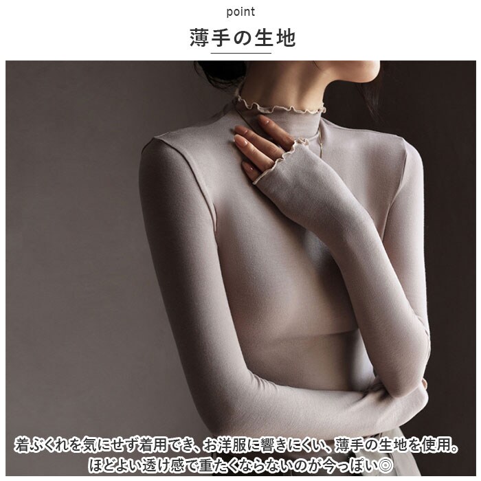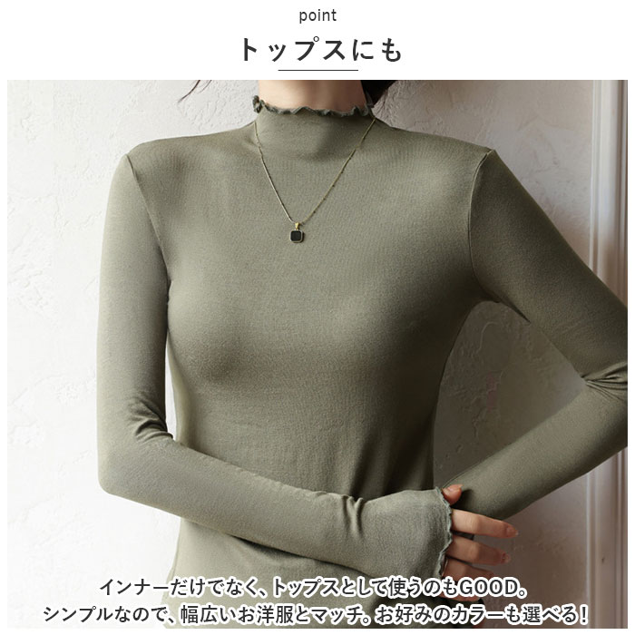 | 商品説明 | ゆらゆらニュアンスのメロウネックが可愛い♪ レディースインナー が登場。【メロウネック】ゆらゆらニュアンスが可愛い、メロウネックがトレンド☆レイヤードスタイルでチラッと見せる、首元と袖のメロウがさり気なくおしゃれ!【柔軟性に優れたなめらかな生地】よく伸びる柔軟性で、身体にぴったりフィット。ビスコース素材を使用したなめらかでサラリとした生地は、肌触りも良く動きやすいので、インナーに最適。【薄手の生地】着ぶくれを気にせず着用でき、お洋服に響きにくい、薄手の生地を使用。ほどよい透け感で重たくならないのが今っぽい◎【あったか肌着】長袖タイプでしっかりあたたかい♪ピタッと身体にフィットするので、熱を逃さずにキープできる。【トップスにも】インナーだけでなく、トップスとして使うのもGOOD。シンプルなので、幅広いお洋服とマッチ。お好みのカラーも選べる! |