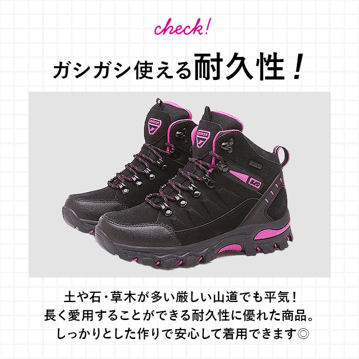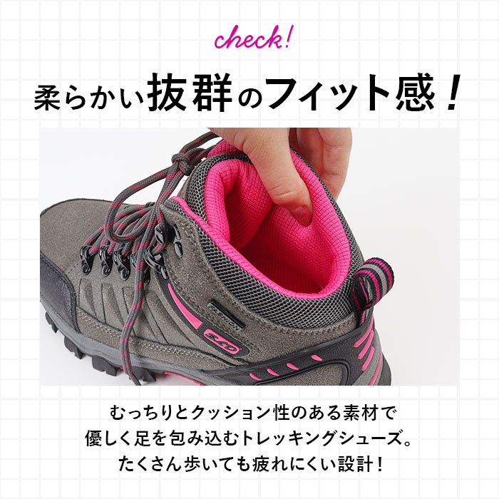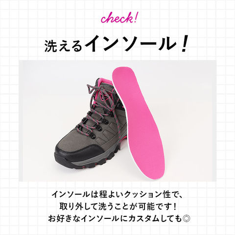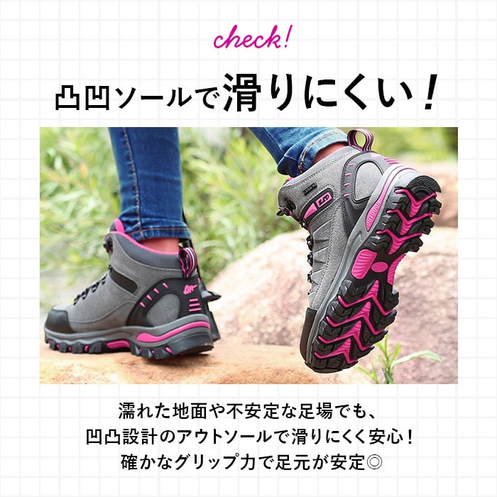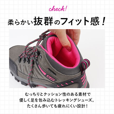 | 商品説明 | 【タフな履き心地が魅力】アウトドアや登山などで大活躍☆トレッキングシューズが登場。【しっかりした作りで安心◎】がっちりしたアウトソールは耐久性に優れ、アウトドアシーンでもタフに履きこなせる!【デコボコソールで地面をグリップ】濡れた地面や不安定な足場でも、確かなグリップ力で滑りにくく足元が安定する。【クッション性のある柔らかな靴内】むっちりとクッション性の優れた靴内が、足への負担を軽減。たくさん歩いても疲れにくい。【足にキュッとフィットする】靴紐をキュッと結べば、フィット感がさらにUP!足首まで支えるハイカットが魅力。【洗えるインソールで清潔】インソールは取り外しOK。いつでも気軽に洗えるので清潔さをキープできる。 |