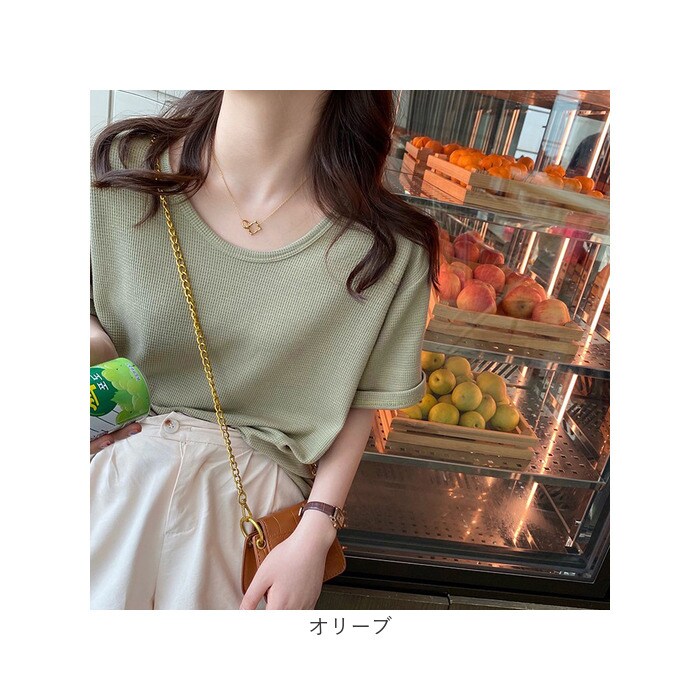 ワッフルカットソー トップス【オリーブ】【XLサイズ】
