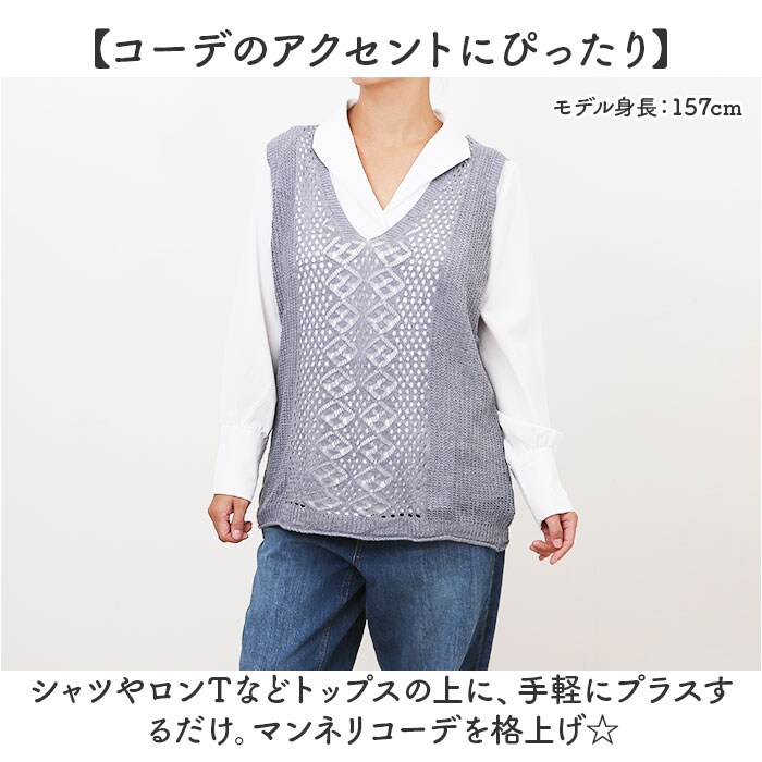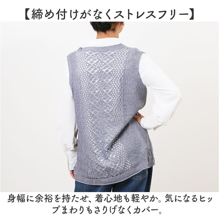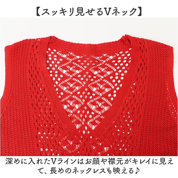 | 商品説明 | 【1枚プラスでこなれ感アップ】コーデの幅が広がる♪おしゃれにレイヤードできる「ニットベスト」。【コーデのアクセントにぴったり】シャツやロンTなどトップスの上に、手軽にプラスするだけ。マンネリコーデを格上げ☆【どんなスタイルも素敵にマッチ】シンプルで落ち着いたワンカラー仕上げ。重い印象を与えない、透かし編みデザイン。【スッキリ見せるVネック】深めに入れたVラインはお顔や襟元がキレイに見えて、長めのネックレスも映える♪【締め付けがなくストレスフリー】身幅に余裕を持たせ、着心地も軽やか。気になるヒップまわりもさりげなくカバー。【お気に入りを選べるカラー】コーデに馴染みやすいカラーや差し色をラインナップ。オン・オフ問わず重宝◎ |