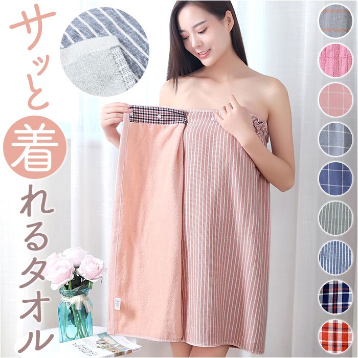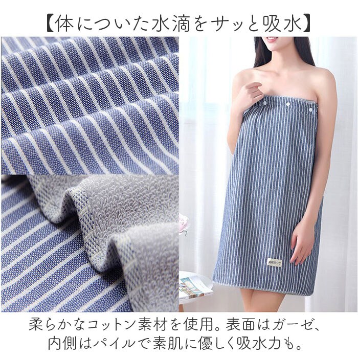| 商品説明 | 【お風呂上がりを快適に♪】ササっと着られて、吸水!ボタン付き「ラップタオル」。【着脱簡単!手軽さが魅力】体に巻き付けて、上部3箇所のボタンを留めるだけ。ボタンの留める位置で調整も可能。【締め付けず心地よいフィット感】背面は伸縮性のあるギャザー仕様。締め付けを感じにくく、ズリ落ちを防いで自分サイズに。【体についた水滴をサッと吸水】柔らかなコットン素材を使用。表面はガーゼ、内側はパイルで素肌に優しく吸水力も。【場所を選ばず大活躍のアイテム】自宅ではもちろん!プールなどのレジャーや、スポーツジムでも使えて万能。【お気に入りを選べるカラー】ワンカラーやストライプなど豊富なラインナップ。色違いで揃えたくなるナチュラルな仕上がり♪ |