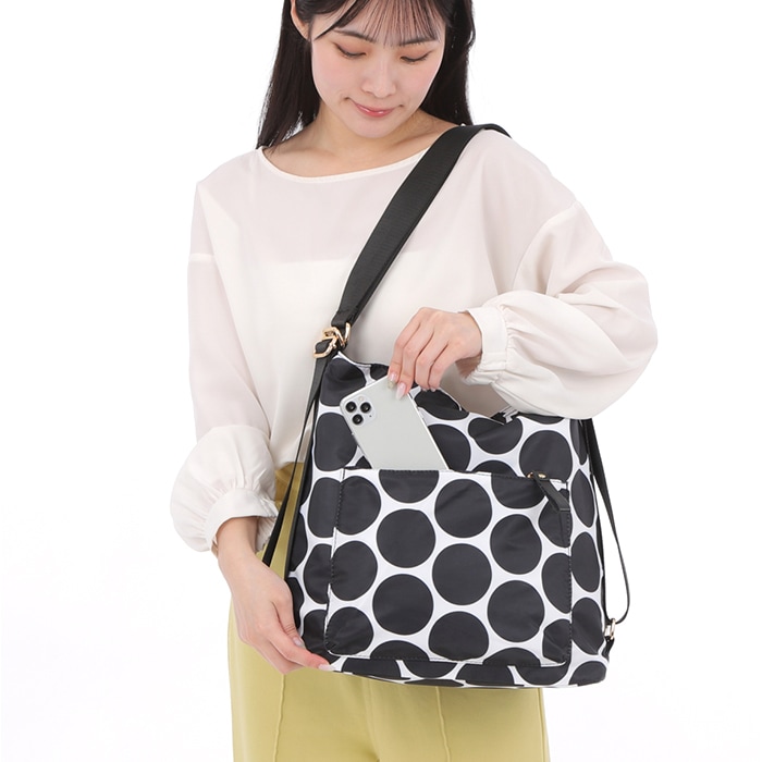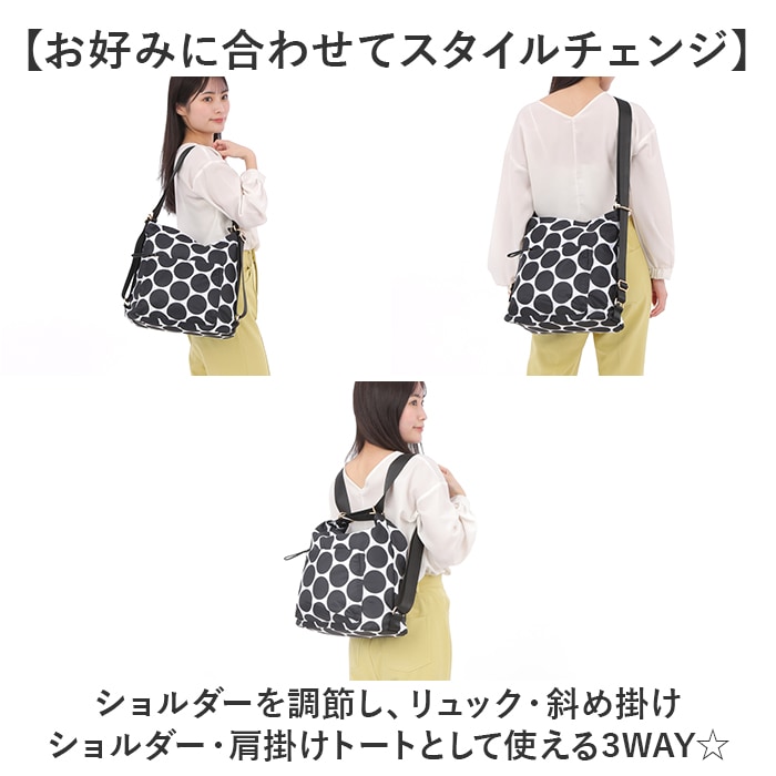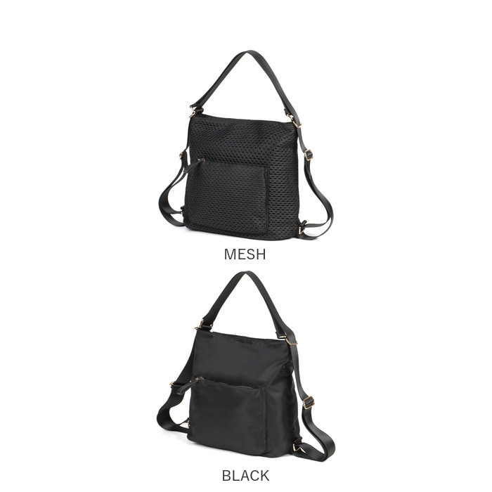 商品説明【お出かけの相棒にぴったり】普段のお出かけや旅行などで活躍◎使い方自在な「Melody ナイロン 3WAYバッグ」。【軽やかで手軽に使えるナイロン製】サラッと軽いナイロンバッグ。耐久性があり外的影響を受けにくく、お手入れも簡単。【お好みに合わせてスタイルチェンジ】ショルダーを調節し、リュック・斜め掛けショルダー・肩掛けトートとして使える3WAY☆【開閉スムーズ、安心の天ファスナー】ガバっと開いて取り出しやすく、ファスナーを閉じれば中身の飛び出しをガード。【A4対応でざっくりひとまとめ】A4が横向きに。程よいマチを設け、ドリンクボトルやポーチなどを収納できるサイズ感。(※1)ソフトな底材を内蔵しております。【サクッと取り出せて迷子知らず】内側・外側それぞれにポケットを配置。バッグの中で、小物を探す手間が不要。【ちょっとの雨なら大丈夫】汚れや水滴を弾きやすい、撥水加工済み。お手入れも拭き取るだけ。(※2)完全防水ではありません。MESHは撥水加工を施しておりません、ご注意ください。【お気に入りを選べるカラー】シンプルなワンカラーや、アクセントになるデザイン。長く愛用できる万能バッグ♪【ポケット仕様】内側:ファスナーポケット×1、オープンポケット×2前面:ファスナーポケット×1背面:ファスナーポケット×1