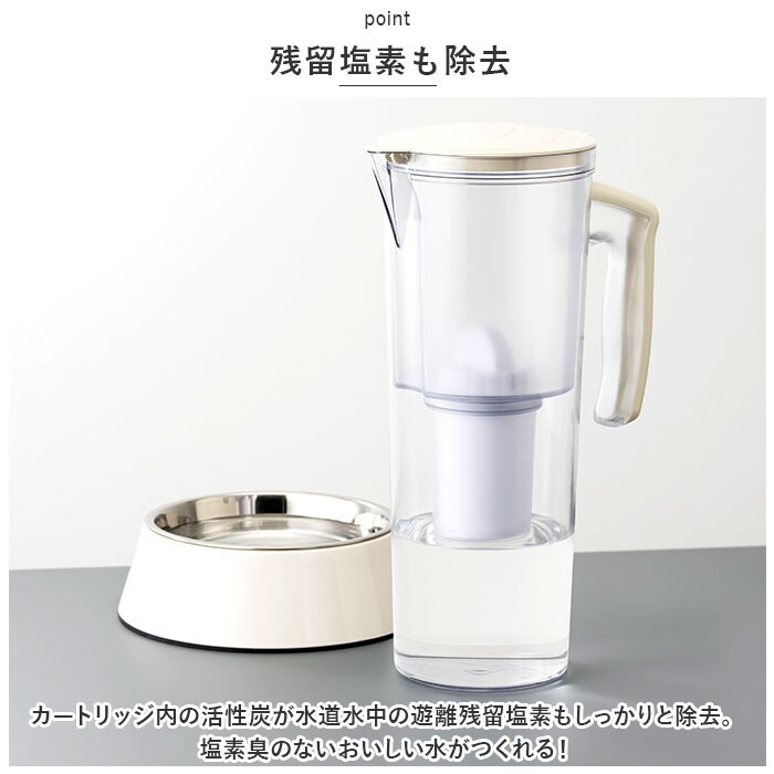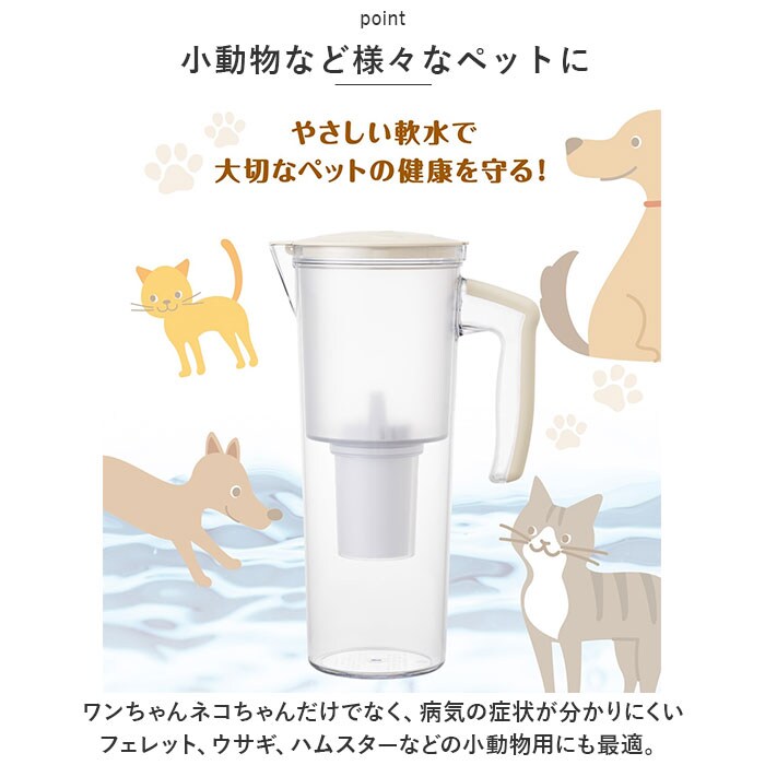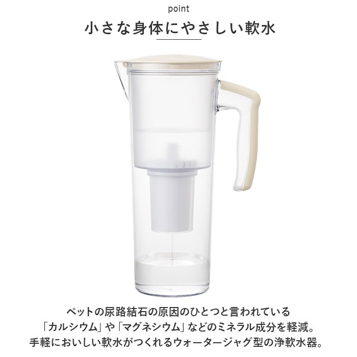 商品説明やさしい軟水で、大切なペットの健康を守る!ペット用浄軟水器「まるっと軟水 大容量」が新登場。【小さな身体にやさしい軟水】ペットの尿路結石の原因のひとつと言われている「カルシウム」や「マグネシウム」などのミネラル成分を軽減。手軽においしい軟水がつくれるウォータージャグ型の浄軟水器。【水道水をまるっと軟水化】「まるっと軟水」のカートリッジが、イオン交換樹脂の力で水道水に含まれる余分なミネラルを除去することで、水道水がペットに優しい軟水に変化。【残留塩素も除去】カートリッジ内の活性炭が水道水中の遊離残留塩素もしっかりと除去。塩素臭のないおいしい水がつくれる!【使い方は簡単3ステップ!】1.肉球マークの刻まれたフタを外して、「まるっと軟水」本体上部の貯水槽にお水を入れる。(※あらかじめ、貯水槽にカートリッジをセットしてください。)2.フタを取り付け、水が全て本体容器に落ちるのを待ちます。(※ろ過時間は約5分~10分程度)3.ろ過されたお水を、水飲み容器に注ぐだけ!【注ぎやすいジャグタイプ】サイドのハンドルを握ってお水が注ぎやすいウォータージャグタイプ。ろ過したお水を冷蔵庫のドアポケットにしまっておけるのでとっても便利。(※ろ過したお水はその日のうちに使い切ってください。)【たっぷり容量750ml】一度に750mlのおいしい軟水がつくれる、たっぷり容量750ml。ワンちゃんネコちゃんを多頭飼いされているお宅でも大活躍!【小動物など様々なペットに】ワンちゃんネコちゃんだけでなく、病気の症状が分かりにくいフェレット、ウサギ、ハムスターなどの小動物用にも最適。【別売りの交換カートリッジが便利】カートリッジ交換の際は、別売りの「まるっと軟水ペット用カートリッジ3個セット」が便利です。(※カートリッジ交換時期は、お使いの地域の水質により異なります。ストアの検索窓に英数字の商品コード「mncp36072」を入力し、検索してください。)