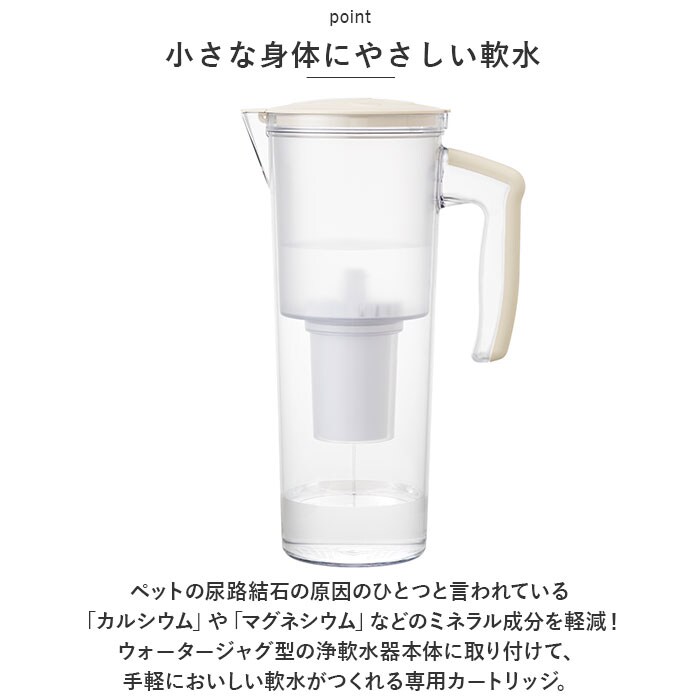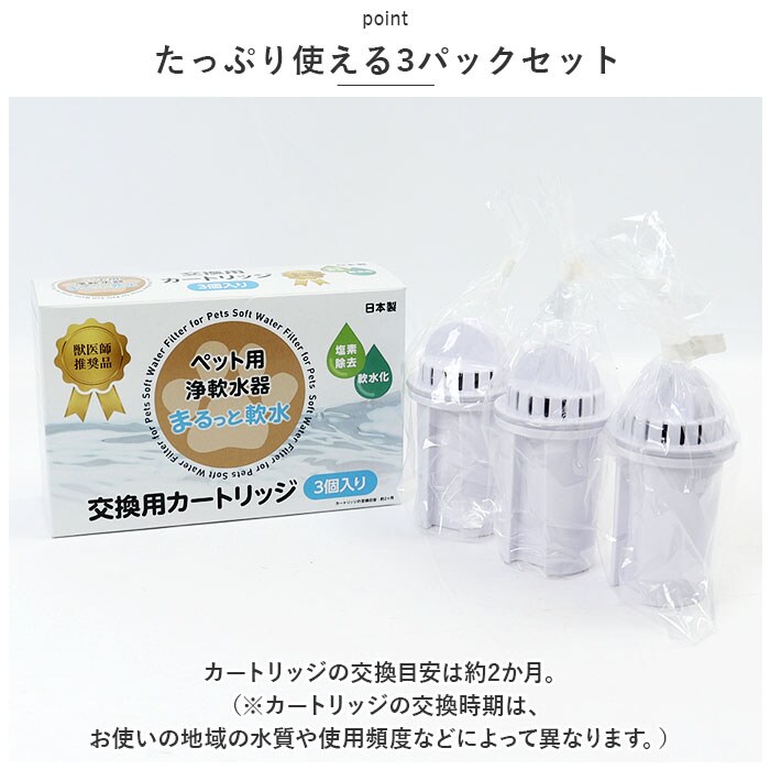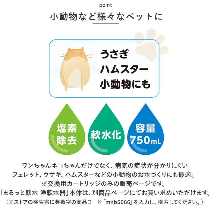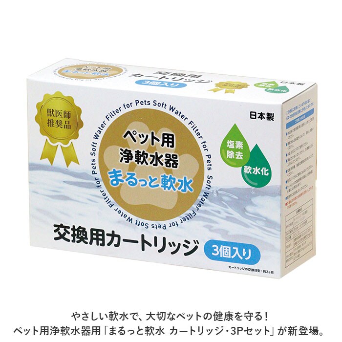 | 商品説明 | やさしい軟水で、大切なペットの健康を守る!ペット用浄軟水器用「まるっと軟水 カートリッジ・3Pセット」が新登場。【小さな身体にやさしい軟水】ペットの尿路結石の原因のひとつと言われている「カルシウム」や「マグネシウム」などのミネラル成分を軽減!ウォータージャグ型の浄軟水器本体に取り付けて、手軽においしい軟水がつくれる専用カートリッジ。【水道水をまるっと軟水化】「まるっと軟水」のカートリッジが、イオン交換樹脂の力で水道水に含まれる余分なミネラルを除去することで、水道水がペットに優しい軟水に変化。【残留塩素も除去】カートリッジ内の活性炭が水道水中の遊離残留塩素もしっかりと除去。塩素臭のないおいしい水がつくれる!【使い方は簡単3ステップ!】1.肉球マークの刻まれたフタを外し、「まるっと軟水」本体上部の貯水槽にカートリッジを取り付け、水道水を入れる。2.フタを取り付け、水が全て本体容器に落ちるのを待ちます。(※ろ過時間は約5分~10分程度)3.ろ過されたお水を、水飲み容器に注ぐだけ!【たっぷり使える3パックセット】カートリッジの交換目安は約2か月。(※カートリッジの交換時期は、お使いの地域の水質や使用頻度などによって異なります。)【小動物など様々なペットに】ワンちゃんネコちゃんだけでなく、病気の症状が分かりにくいフェレット、ウサギ、ハムスターなどの小動物用のお水づくりにも最適。※交換用カートリッジのみの販売ページです。「まるっと軟水 浄軟水器」本体は、別商品ページにてお買い求めいただけます。(※ストアの検索窓に英数字の商品コード「mnb6066」を入力し、検索してください。) |