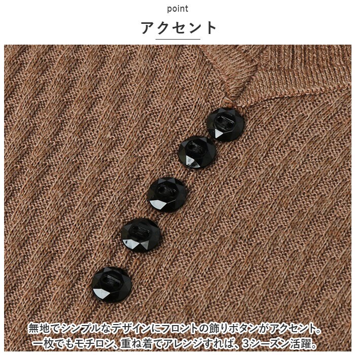 | 商品説明 | 一枚でこなれた雰囲気を演出♪「トップス ニット 長袖」の登場。【一枚でキマル★】Vネックの首元がシャープな印象。一枚でこなれた雰囲気を演出。【通気性◎】肌触りが気持ちよく、薄手素材で通気性もいいから蒸れにくく快適◎【アクセント】無地でシンプルなデザインにフロントの飾りボタンがアクセント。一枚でもモチロン、重ね着でアレンジすれば、3シーズン活躍。【お手入れラクチン】シワになりにくく型崩れもしにくいので、お手入れがラクチン!【オン・オフ問わず大活躍】手首まで覆う長袖部分はリブ編みで上品仕立て。オン・オフ問わず大活躍!ジャケットやパーカーなどのインナーにもぴったり★ |