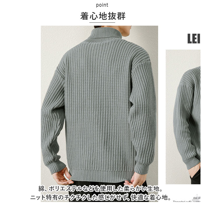 | 商品説明 | シンプルで万能。秋冬にひとつは持ちたいマストアイテム☆メンズ タートルネックニットが登場。【シンプルデザイン】無地のシンプルデザイン。デイリー使いやお出かけ、リラックスシーンなど。いつでも使える万能ニット。【タートルネック】首元は折りかえして着るタートルネックタイプ。寒い季節にぴったりで、マフラーいらず。シンプルだけど形で魅せるおしゃれさ♪【着心地抜群】綿、ポリエステルなどを使用した柔らかい生地。ニット特有のチクチクした感じがせず、快適な着心地。【カジュアル感】ワッフル生地のような凹凸のある生地。ほどよいカジュアル感を演出してくれるので、着回しがしやすい。【選べるカラー】落ちつきのあるベーシックカラーのバリエーション。お気に入りをチョイス! |