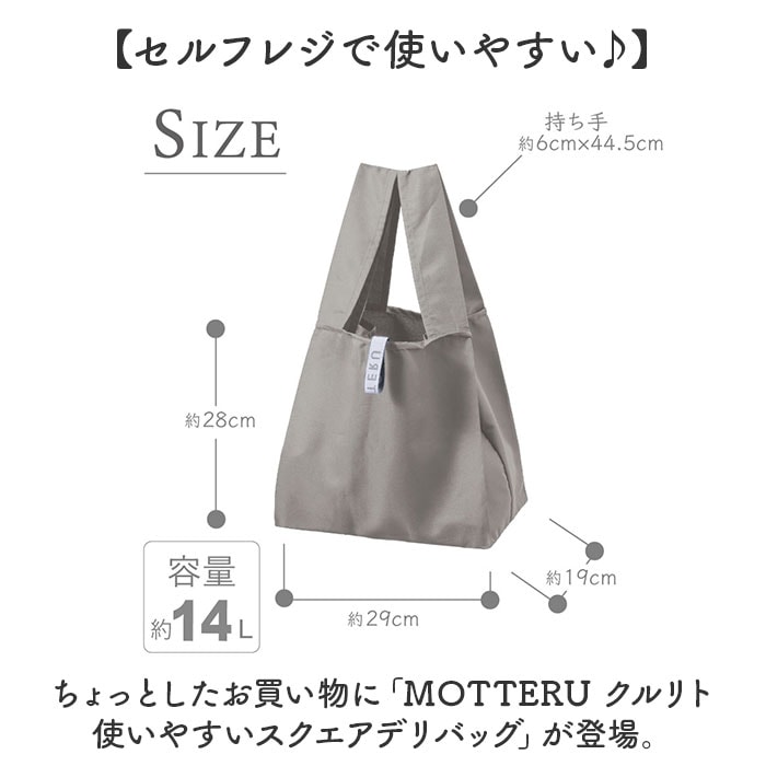 | 商品説明 | 【セルフレジで使いやすい♪】ちょっとしたお買い物に「MOTTERU クルリト 使いやすいスクエアデリバッグ」が登場。【セルフレジに対応できる新機能】セルフレジで大活躍する、2通りの引っ掛け紐を搭載。広いマチで荷物が入れやすい◎【ちょっとした買い物にぴったり】日常のお買いものや、荷物の持ち運びに便利な約14リットルサイズ。毎日持ち歩きたい♪【無駄なく入るスクエア型】持ちやすいサイズ感なのにたっぷり入る、スクエア型。見た目も可愛いシルエット。【くるっとまるめてコンパクトに】使わないときは折りたたんで、付属のゴムバンドで留めれば持ち運びもストレスフリー。【お洗濯OKなのが嬉しいポイント】汚れやニオイが気になったら、お洗濯が可能。いつでも清潔にできるのが◎【みんなで使えるシンプルデザイン】年齢性別を問わずに使える、おしゃれなシンプルデザイン。家族で共有できる。 |