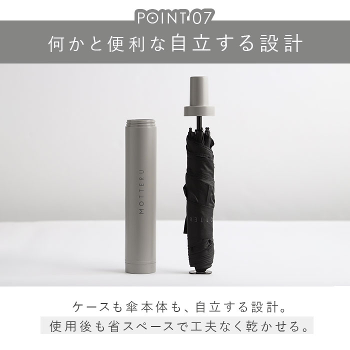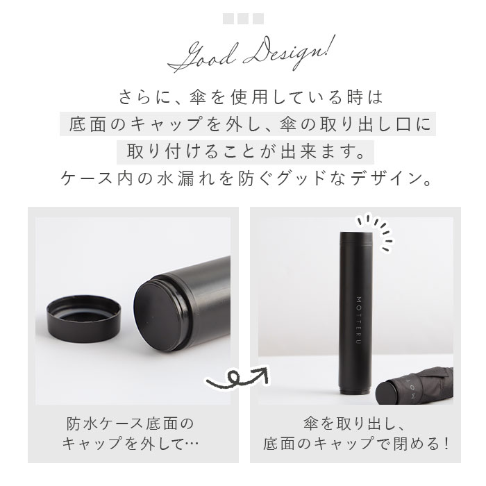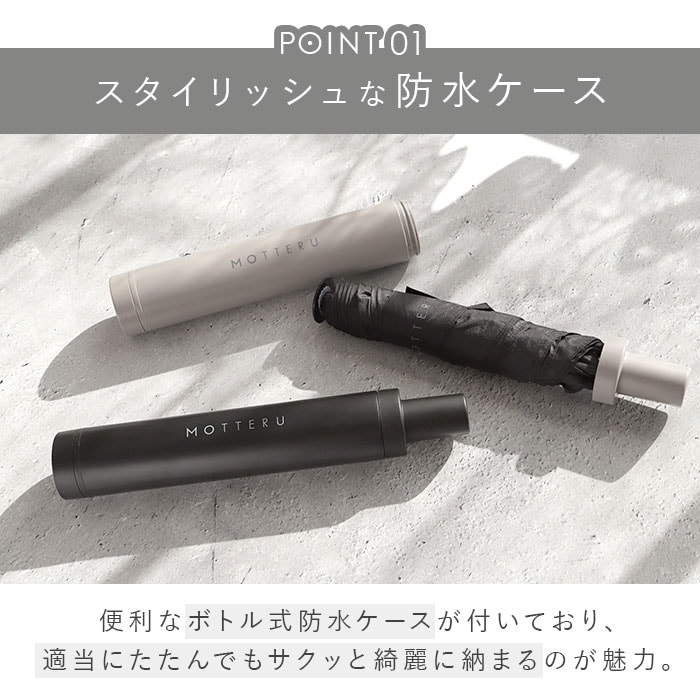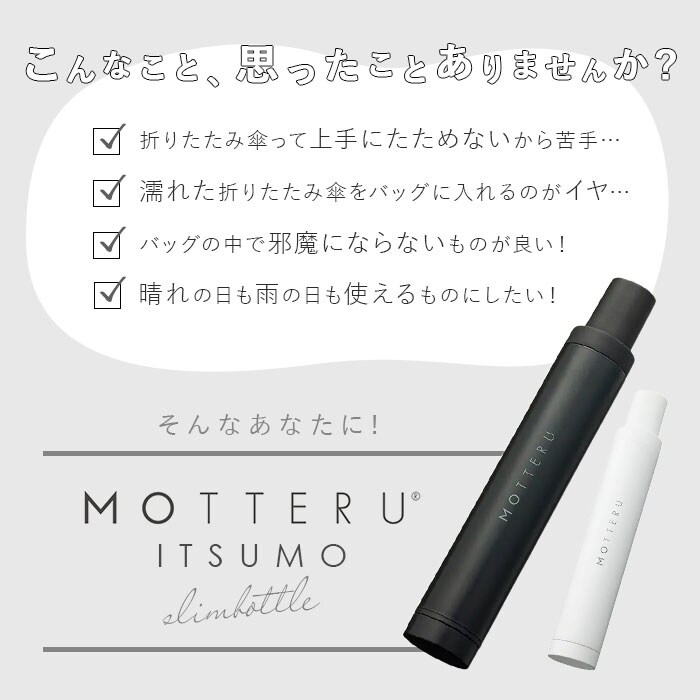 | 商品説明 | MOTTERUよりITSUMOスリムボトル折りたたみ傘LIGHTが新登場。(親骨50cm)UVカットが施された傘生地を使用し、晴雨兼用で使える傘。MOTTERUのロゴが入った傘のバンドは傘生地をまとめやすい幅広設計。ハンドル部分は手にフィットする持ちやすい構造。使用後の濡れた傘をそのまま収納できる防水ケース付き。傘を使用しているときは、底面のキャップを外して上に付けると中の水が漏れる心配なし。ケースに収納された状態でも、傘を折りたたんだ状態でも自立するつくりだから傘立てがなくても困らない。スリムなデザインに加え約200g以下の軽量設計でバッグの中に収納しやすい。 |