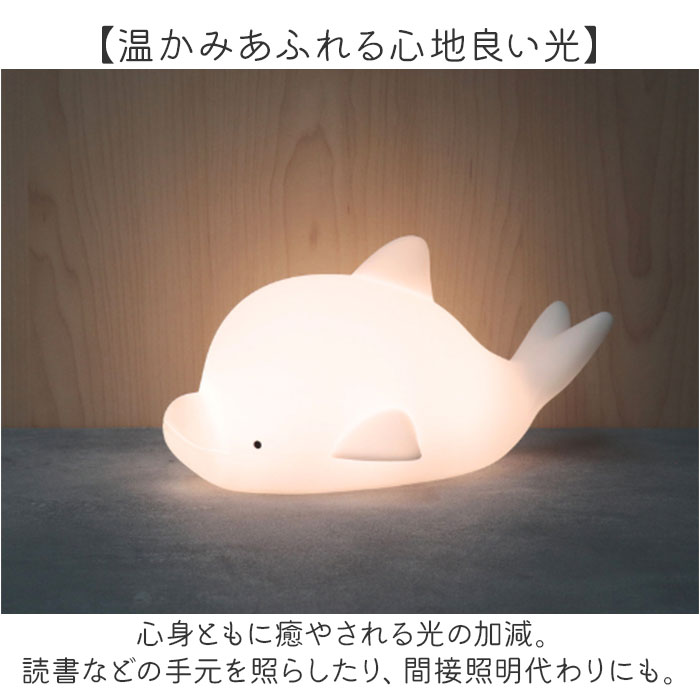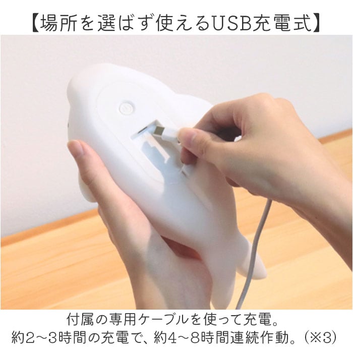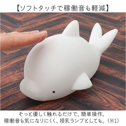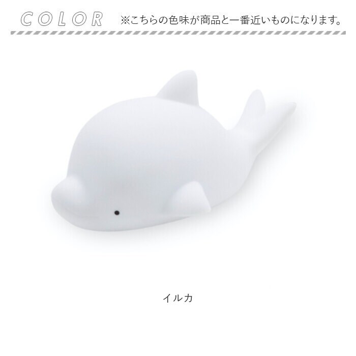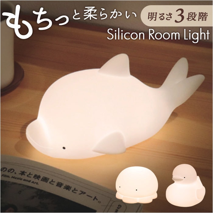 | 商品説明 | 【寝る前のルーティーンにいかが?】優しく照らす光と、愛らしいフォルムにほっこり♪「もちっとルームランプ」。【もちっと柔らか、クセになる質感】手触りが優しく、思わず触れたくなるマットなシリコーン素材。お子さまが触っても安心。【ソフトタッチで稼働音も軽減】そっと優しく触れるだけで、簡単操作。稼働音も気になりにくく、授乳ランプとしても。(※1)反応しない場合はタッチする場所や強度を調整し、強く叩かないでください。【温かみあふれる心地良い光】心身ともに癒やされる光の加減。読書などの手元を照らしたり、間接照明代わりにも。【明るさはお好みで3段階調節OK】底面の電源スイッチを入れると、弱く点灯。1回タッチで少し明るく、2回タッチで最も明るく。(※2)弱→中→強の順に点灯します。3回のタッチでOFFモードに戻り、同じ順番で点灯を繰り返します。【場所を選ばず使えるUSB充電式】付属の専用ケーブルを使って充電。約2~3時間の充電で、約4~8時間連続作動。(※3)充電回数は約300回。充電時間と強で点灯時の連続作動時間目安は、カラーにより異なります。イルカとアヒル:約3時間の充電で、約4時間連続作動。クラゲ:約2時間の充電で、約8時間連続作動。【自分用にも贈り物にもおすすめ】アニマルが、あなたを癒やし空間へ導いてくれる!いつも頑張っている方へのご褒美ギフト☆ |