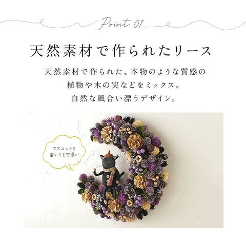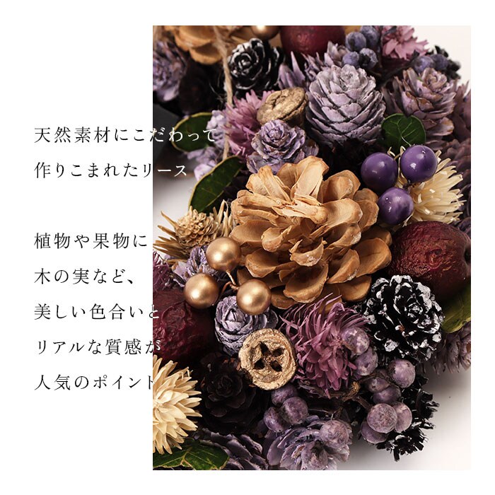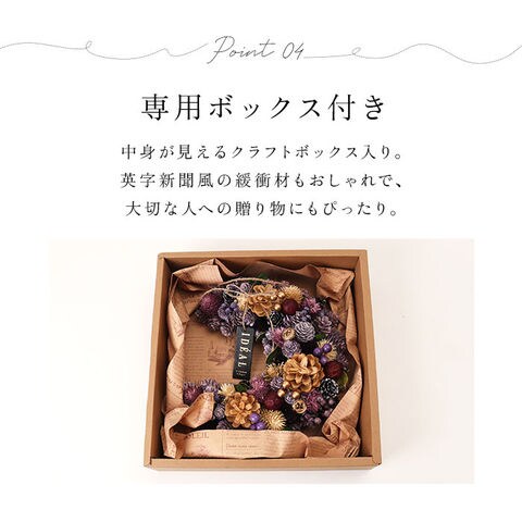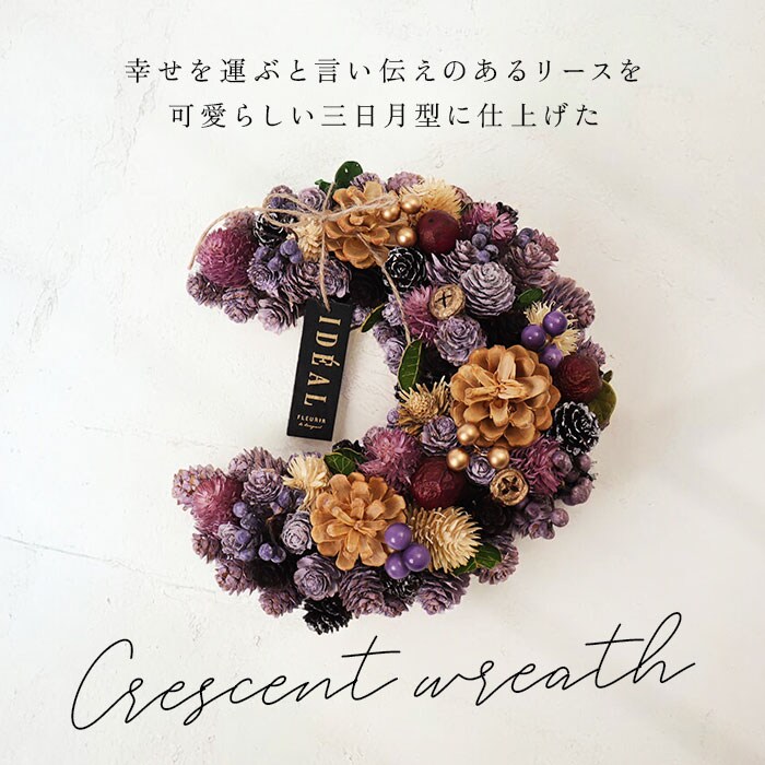 | 商品説明 | 【空間に彩りのアクセントをプラス】まるで本物の植物のような仕上がり。「クレッセントリース」Mサイズ。【”幸せを運ぶ”という言い伝え】お花や葉っぱで作られたリース。「幸運がいつまでも続くように」と願いを込めたアイテム。【空間がパッと華やぐデザイン】天然素材で作られた植物、本物さながらの木の実などをミックス☆自然な風合い漂うデザイン。(※)手作り品のため、個体差があります。【場所を選ばず飾りやすいサイズ】個性の光る三日月型。トイレや玄関、壁のちょっとしたスペースに飾りやすいMサイズ。【水やり不要でお手入れラクラク】面倒なお手入れは必要なし!どなたでも気軽にお花を取り入れられるのが嬉しい♪【サッと壁掛けできて便利】背面の紐を使ってフックなどに掛けるだけ。真っ白な壁が明るい雰囲気にチェンジ。【お祝いのギフトにもおすすめ】中身が見えるクラフトボックス入り。英字新聞風の緩衝材もおしゃれで、贈り物にぴったり。 |