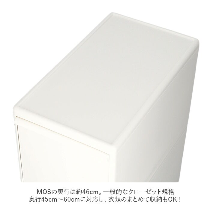 | 商品説明 | 自由自在に組み合わせができる収納ケース「like-it MOS」シリーズから、「ミディL」が登場。本体のモジュールサイズと底のスタッキング構造により、幅の異なる引き出しも組み合わせることが可能◎オールホワイトカラーを採用し、中身が見えないのもポイント!洗剤などのストックを入れても生活感が出にくいのが嬉しい。引き出し奥の左右にストッパーを装備。勢いよく引き出しても抜け落ちることなく安心◎天板は差し込み式だから、ジョイントを外してつなげて使用することも。MOSの奥行は約46cm。一般的なクローゼット規格奥行45cm~60cmに対応し、衣類のまとめて収納もOK!同色・同型の3個セット♪単体で使うのはもちろん当店別ページで販売している、「like-it MOS」シリーズ(計5種類)と組み合わせて使うのもおススメ。さらにキャスターや段差がある場所でも使える別売りアジャスターパーツを取り付けることも可能。【※こちらのページは衣装ケース「ミディL」のみの販売です。キャスター(商品コード:ls33)、アジャスターパーツ(商品コード:ssa4p)は別ページでご購入ください。】 |