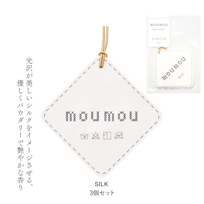 | 商品説明 | 爽やかで清潔感のある香りで人気の「moumou」から、ペーパーエアーフレッシュナーが登場。【moumouとは】日々の暮らしの中で身近な存在である”ファブリック”と同じように、肌に合う香りに包まれて心地よい空間で過ごしてもらいたい…という思いから誕生。【簡単ステップ】吊るすだけのお手軽な香りアイテム。約2~4週間、香りが持続(※ご使用環境により異なります。)【小さな空間も自分らしく】クローゼットやトイレ、車内に柔らかな香りがふわっと広がり、リラックス空間に♪【空間のアクセントに】ファブリックのクッションを想像させる、スティッチデザイン◎【ちょっとしたギフトにも】シンプル&おしゃれなデザインで、贈り物にもぴったり。安心の日本製。【清潔感のあるやさしい香り】COTTON…やわらかく包み込むコットンをイメージさせる、温もりのある清らかな香り。SILK…光沢が美しいシルクをイメージさせる、優しくパウダリーで艶やかな香りLINEN…軽くやわらかなリネンをイメージさせる、透き通るような爽やかな香り。WOOL…柔らかな肌触りのウールをイメージさせる、ふんわりと暖かく包み込むような香り。 |