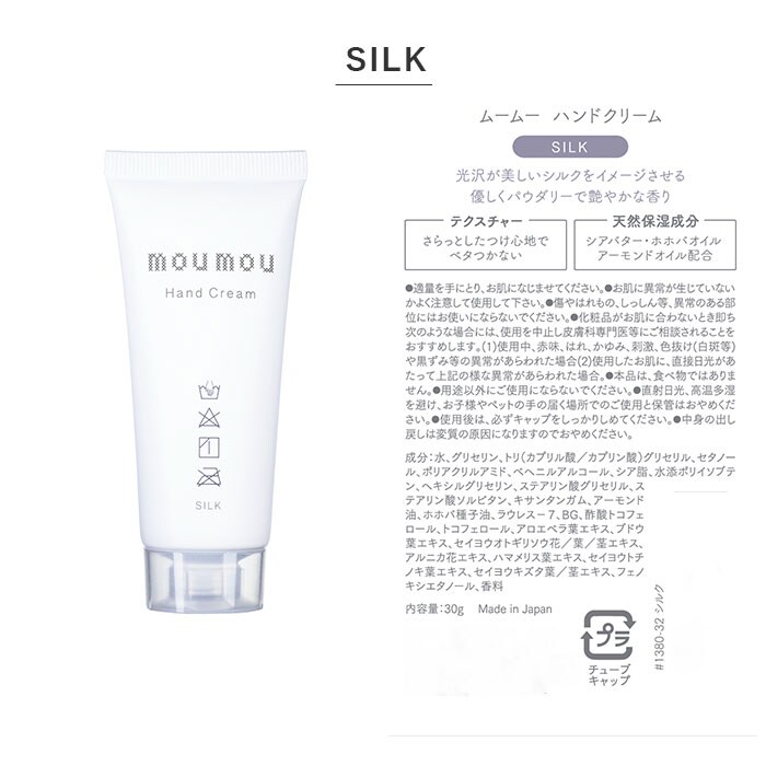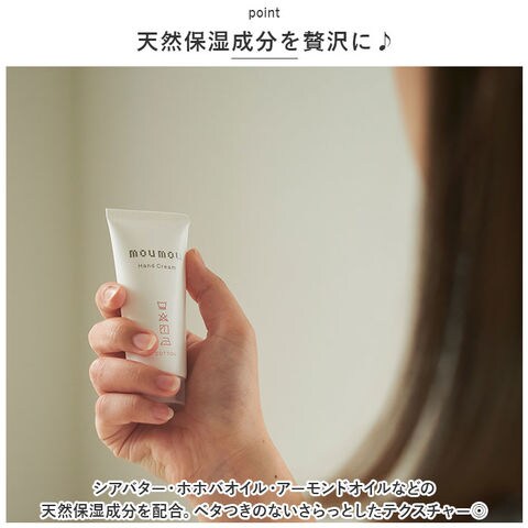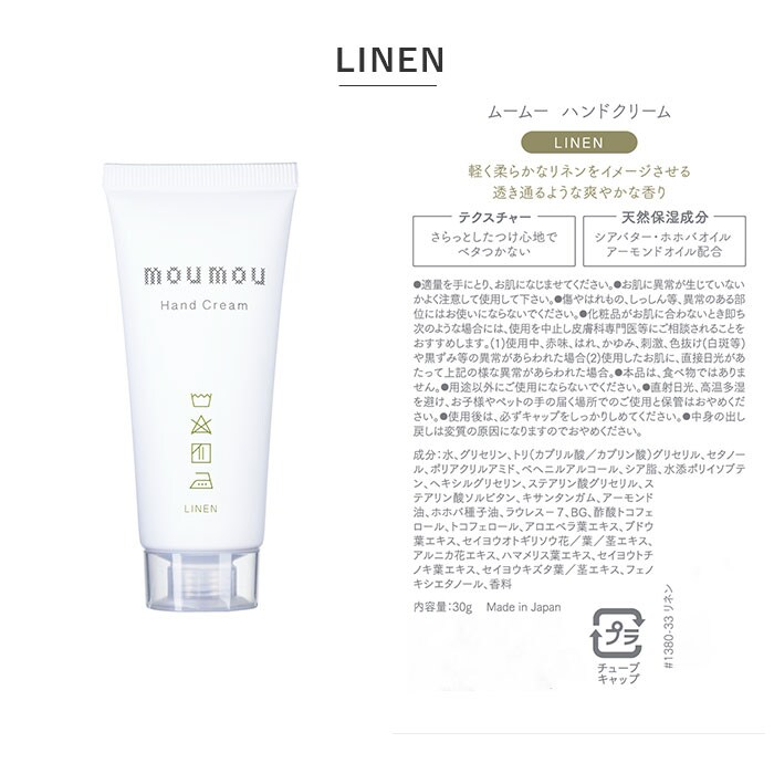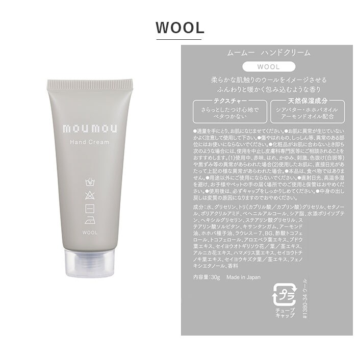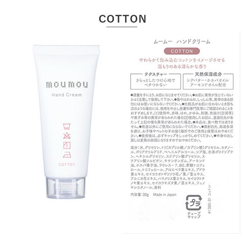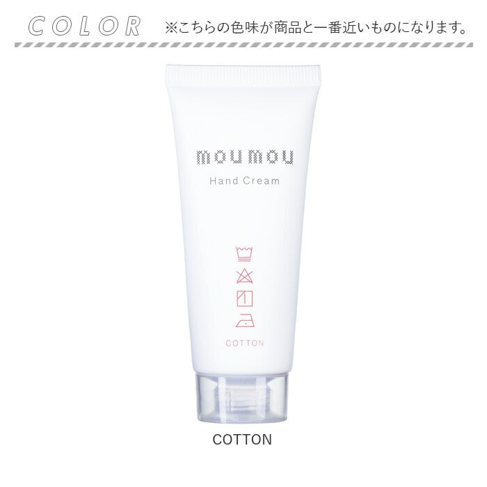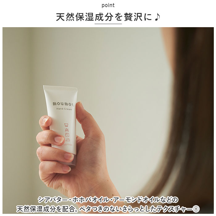 | 商品説明 | 爽やかで清潔感のある香りで人気の「moumou」から、ハンドクリームが登場。【moumouとは】日々の暮らしの中で身近な存在である”ファブリック”と同じように、肌に合う香りに包まれて心地よい空間で過ごしてもらいたい…という思いから誕生。【天然保湿成分を贅沢に♪】シアバター・ホホバオイル・アーモンドオイルなどの天然保湿成分を配合。【手肌をやわらかく保湿】ベタつきのないさらっとしたテクスチャー◎【小さくて心強いパートナー!】可愛らしいサイズ感。小ぶりなバッグやポーチにサッと忍ばせて、一緒にお出かけ♪【ちょっとしたギフトにも】シンプル&おしゃれなパッケージで、贈り物にもぴったり。安心の日本製。【清潔感のあるやさしい香り】COTTON…やわらかく包み込むコットンをイメージさせる、温もりのある清らかな香り。SILK…光沢が美しいシルクをイメージさせる、優しくパウダリーで艶やかな香りLINEN…軽くやわらかなリネンをイメージさせる、透き通るような爽やかな香り。WOOL…柔らかな肌触りのウールをイメージさせる、ふんわりと暖かく包み込むような香り。 |