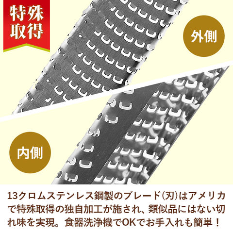| 商品説明 | マイクロプレインゼスターグレーターはスタイリッシュでとっても便利なおろし金。生姜は繊維を断ち切って滑らかに仕上げることができ、玉ねぎはドレッシング用に細かくおろせる!パルメザンチーズをイタリアン用にパウダー状にしたり、柑橘類は皮の表面だけを薄く削ぎおろして、お菓子作り用に活用したりと使い方いろいろ。13クロムステンレス鋼製のブレード(刃)はアメリカで特殊取得の独自加工が施され、類似品にはない切れ味を実現。「microplane」のロゴが入ったエラストマー樹脂製ハンドルのグリップは、持ちやすくおろし作業がとっても楽にできる。アーモンドやナツメグ、チョコレートなどの硬いものも力を入れずに簡単に粉末状におろすことが可能。ブレード部を保護するプラスチックカバーが付属。カバーを外せば、食器洗浄機でも洗うことができ、お手入れ簡単!キノコとチーズのリゾット、ウィークエンドシトロンなど、すぐにレパートリーに加えられる料理研究家によるレシピブック付き。 |