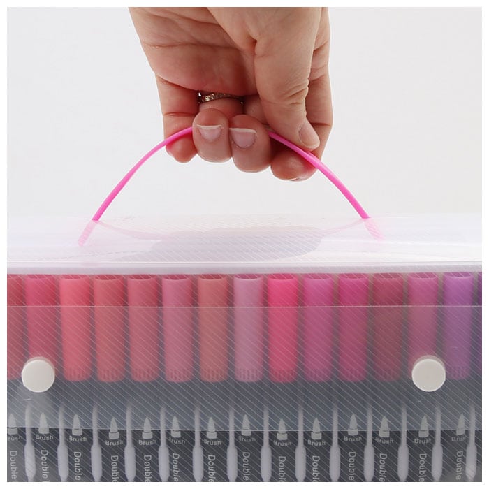 | 商品説明 | 描きたい自分色がきっと見つかる!たっぷり100色、水性カラーマーカーが新登場。細く繊細に描ける「Fine」タイプと、太くダイナミックに描ける筆タイプの「Brush」、2種類のペン先で描き分けが自在なダブルヘッド仕様。紙の裏に色が写りにくい水性インクを採用し、イラストを趣味にされている方にはもちろん、塗り絵が大好きなお子さまにもピッタリ。(対象年齢6歳以上)全100色のマーカーが整然と収納できる、5段式の専用クリア収納ボックス付き!持ち手ハンドル付きで、収納ラックや本棚にすっきりお片付けできちゃうのも嬉しいポイント♪ペン軸のカラーは、ホワイトとブラックの2種類。お部屋のインテリアや気分に合わせてチョイス可能。大人から子供まで楽しめる、おうち時間をカラフルに彩る本格派ステーショナリー! |