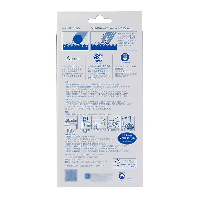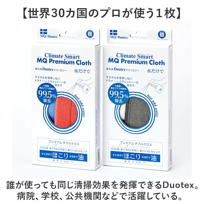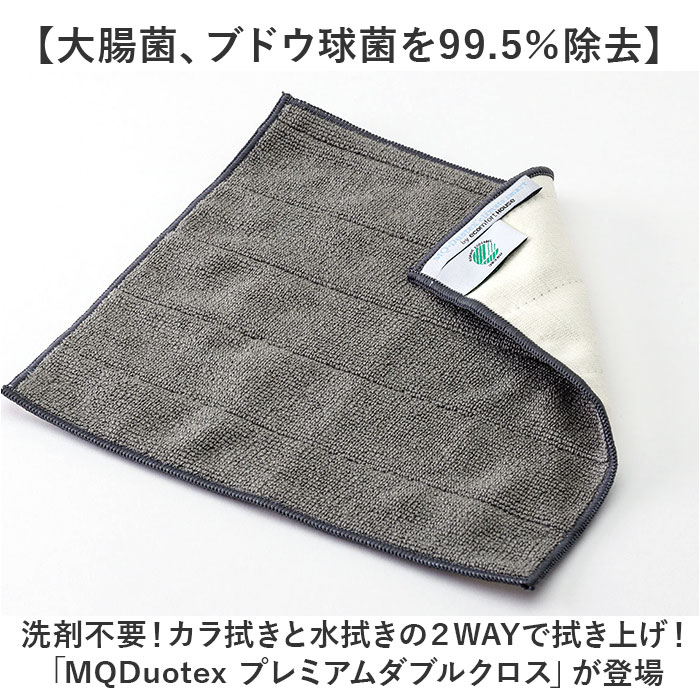 | 商品説明 | 【大腸菌、ブドウ球菌を99.5%除去】洗剤不要!カラ拭きと水拭きの2WAYで拭き上げ!「MQDuotex プレミアムダブルクロス」が登場【ウルトラマイクロファイバー100%】繊維を水蒸気で割き、生地の凸凹で静電気を発生させ、細かいホコリや多くの汚れをかき取る◎【洗剤不要◎手指や環境に優しい】カラ拭きでホコリやミクロの汚れを除去。油性汚れは水拭きで対応できるから、洗剤が不要!【ペットやお子様がいる家庭に♪】洗剤を使いたくない、レンジや冷蔵庫、お子様やペットが触れる場所も安心してクリーンアップ◎【どんな凸凹にもフィットする】髪の毛の1/120の超極細繊維が、どんな凸凹にも入り込み汚れをかき取ってくれる。【プロ仕様の耐久性が自慢】業務用に開発された商品だから、繰り返し使っても効果は落ちない◎長く使えてエコ!【景観を邪魔しないシンプルさ】シンプルなバイカラーで仕上げたアイテム。リビングに置いてもOKなのがポイント。【家中どこでもお掃除できる】表地で汚れをかき取り、裏でピカピカ仕上げ!鏡、窓、コンロ、TVなどのお掃除に◎【世界30カ国のプロが使う1枚】誰が使っても同じ清掃効果を発揮できるDuotex。病院、学校、公共機関などで活躍している。 |