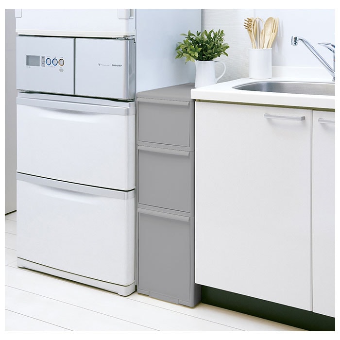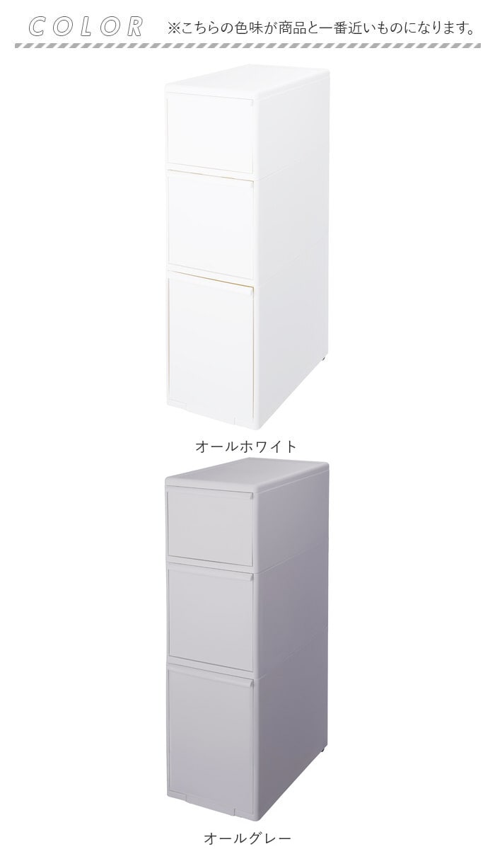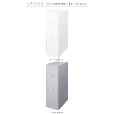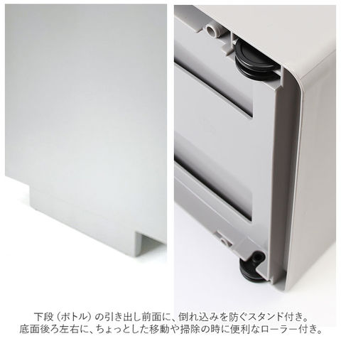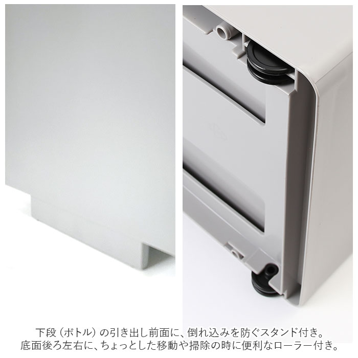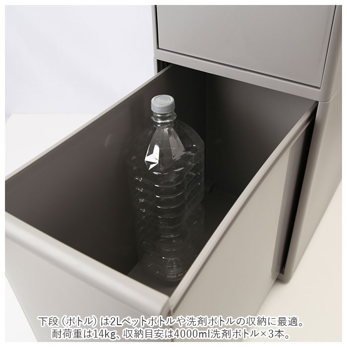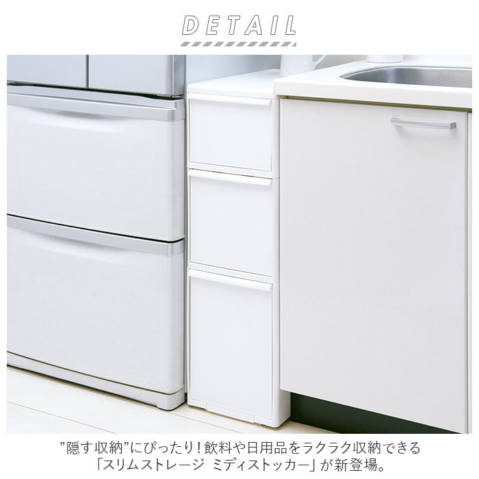 | 商品説明 | ”隠す収納”にぴったり!飲料や日用品をラクラク収納できる「スリムストレージ ミディストッカー」が新登場。キッチンやリビング、サニタリースペースなどのちょっとしたすき間で使える収納ストッカー。透け感がないので、洗剤などのストックを入れても生活感が出にくいのがポイント。深さの異なる3段引き出し式。取っ手付きで引き出しがラクラク!引き出し奥の左右にストッパーを装備。勢いよく引き出しても抜け落ちることなく安心◎上段(中)は350ml缶のお酒、粉末洗剤、フェイスタオルの収納に。耐荷重は5kg、収納目安は粉末洗剤×4個。中段(深)には500mlペットボトル、シャンプーボトル、バスタオルをIN。耐荷重は5kg、収納目安はバスタオル×5枚。下段(ボトル)は2Lペットボトルや洗剤ボトルの収納に最適。耐荷重は14kg、収納目安は4000ml洗剤ボトル×3本。下段(ボトル)の引き出し前面に、倒れ込みを防ぐスタンド付き。底面後ろ左右に、ちょっとした移動や掃除の時に便利なローラー付き。安心の日本製。デッドスペースを有効活用して、すっきり整理整頓♪当店別ページで販売している、キャスターや段差がある場所でも使えるアジャスターパーツを取り付けることも可能。【※こちらのページはストッカーのみの販売です。キャスター(商品コード:ls33)、アジャスターパーツ(商品コード:ssa4p)は別ページでご購入ください。】 |