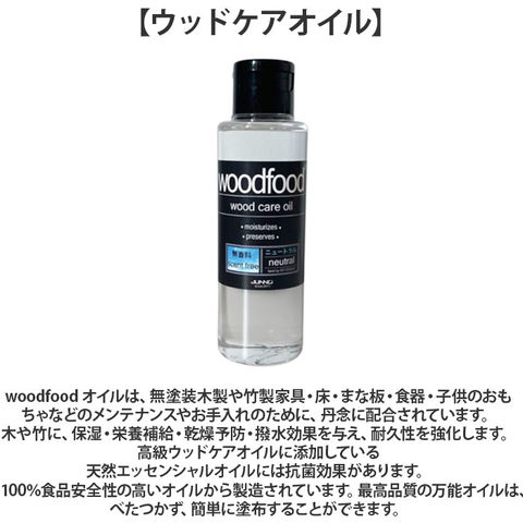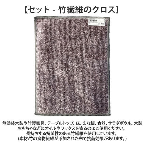 | 商品説明 | 【ウッドケアワックス】woodfoodワックスは、無塗装木製や竹製家具・床・まな板・食器・子供のおもちゃなどのメンテナンスやお手入れのために、丹念に配合されています。木や竹に、保湿・栄養補給・乾燥予防・撥水効果を与え、耐久性を強化します。高級ウッドケアワックスの蜜蝋に添加している天然エッセンシャルオイルには抗菌効果があります。100%天然の蜜蝋と食品安全性の高いオイルから製造されています。塗りやすく、少量で済む経済的なソフトワックスです。【ウッドケアオイル】woodfood オイルは、無塗装木製や竹製家具・床・まな板・食器・子供のおもちゃなどのメンテナンスやお手入れのために、丹念に配合されています。木や竹に、保湿・栄養補給・乾燥予防・撥水効果を与え、耐久性を強化します。高級ウッドケアオイルに添加している天然エッセンシャルオイルには抗菌効果があります。100%食品安全性の高いオイルから製造されています。最高品質の万能オイルは、べたつかず、簡単に塗布することができます。【セット - 竹繊維のクロス】無塗装木製や竹製家具、テーブルトップ、床、まな板、食器、サラダボウル、木製おもちゃなどにオイルやワックスを塗るのにご使用ください。長持ちする抗菌性のある竹繊維を使用しています。(素材:竹の食物繊維が添加された布で抗菌効果があります。) |