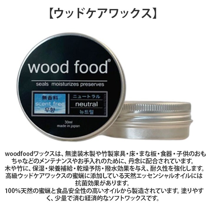 | 商品説明 | 【ウッドケアワックス】woodfoodワックスは、無塗装木製や竹製家具・床・まな板・食器・子供のおもちゃなどのメンテナンスやお手入れのために、丹念に配合されています。木や竹に、保湿・栄養補給・乾燥予防・撥水効果を与え、耐久性を強化します。高級ウッドケアワックスの蜜蝋に添加している天然エッセンシャルオイルには抗菌効果があります。100%天然の蜜蝋と食品安全性の高いオイルから製造されています。塗りやすく、少量で済む経済的なソフトワックスです。【ウッドケアオイル】woodfoodオイルは、無塗装木製や竹製家具・床・まな板・食器・子供のおもちゃなどのメンテナンスやお手入れのために、丹念に配合されています。木や竹に、保湿・栄養補給・乾燥予防・撥水効果を与え、耐久性を強化します。高級ウッドケアオイルに添加している天然エッセンシャルオイルには抗菌効果があります。100%食品安全性の高いオイルから製造されています。最高品質の万能オイルは、べたつかず、簡単に塗布することができます。【セット - 竹繊維のクロス】無塗装木製や竹製家具、テーブルトップ、床、まな板、食器、サラダボウル、木製おもちゃなどにオイルやワックスを塗るのにご使用ください。長持ちする抗菌性のある竹繊維を使用しています。(素材:竹の食物繊維が添加された布で抗菌効果があります。) |