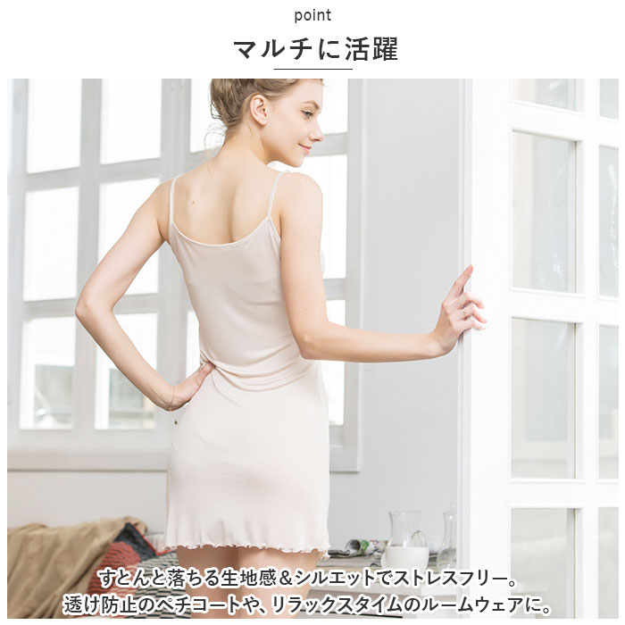 | 商品説明 | 快適な着心地♪お肌に優しい、シルク素材のキャミソールスリップが新登場。【機能性の高いシルク素材】さらっと柔らかなシルク素材を採用。吸湿性・放湿性に優れ、季節問わず快適。摩擦が少なく、滑らかな肌触りも特徴◎【自分サイズにフィット】肩紐を自由に調節可能。お好みや身長に合わせて丈感を微調整。【マルチに活躍】すとんと落ちる生地感&シルエットでストレスフリー。透け防止のペチコートや、リラックスタイムのルームウェアに。【お手入れ簡単】自宅で手洗いできるから、お手入れラクラク。乾きが早いのも嬉しいポイント。【大人な仕上がり】どなたでも着用しやすいカラー展開。裾部分にメロウデザインを取り入れることで、さりげなく上品な印象に♪ |