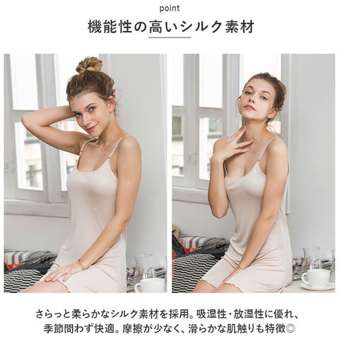 | 商品説明 | 快適な着心地♪お肌に優しい、シルク素材のキャミソールスリップが新登場。【機能性の高いシルク素材】さらっと柔らかなシルク素材を採用。吸湿性・放湿性に優れ、季節問わず快適。摩擦が少なく、滑らかな肌触りも特徴◎【自分サイズにフィット】肩紐を自由に調節可能。お好みや身長に合わせて丈感を微調整。【マルチに活躍】すとんと落ちる生地感&シルエットでストレスフリー。透け防止のペチコートや、リラックスタイムのルームウェアに。【お手入れ簡単】自宅で手洗いできるから、お手入れラクラク。乾きが早いのも嬉しいポイント。【大人な仕上がり】どなたでも着用しやすいカラー展開。裾部分にメロウデザインを取り入れることで、さりげなく上品な印象に♪ |