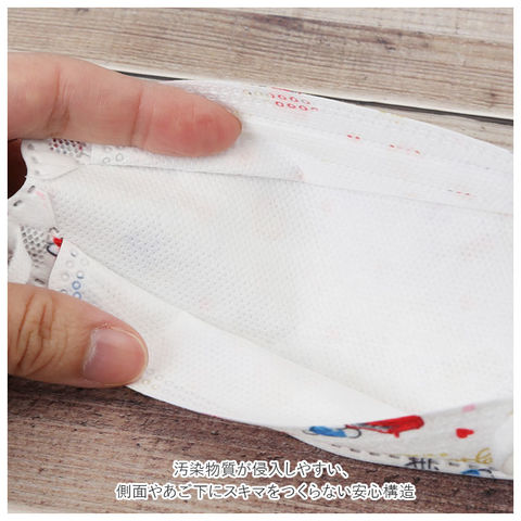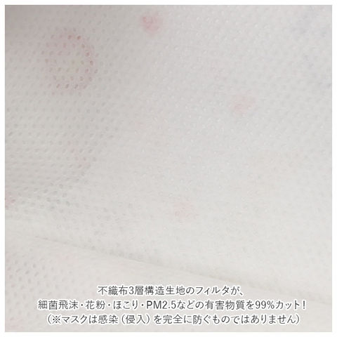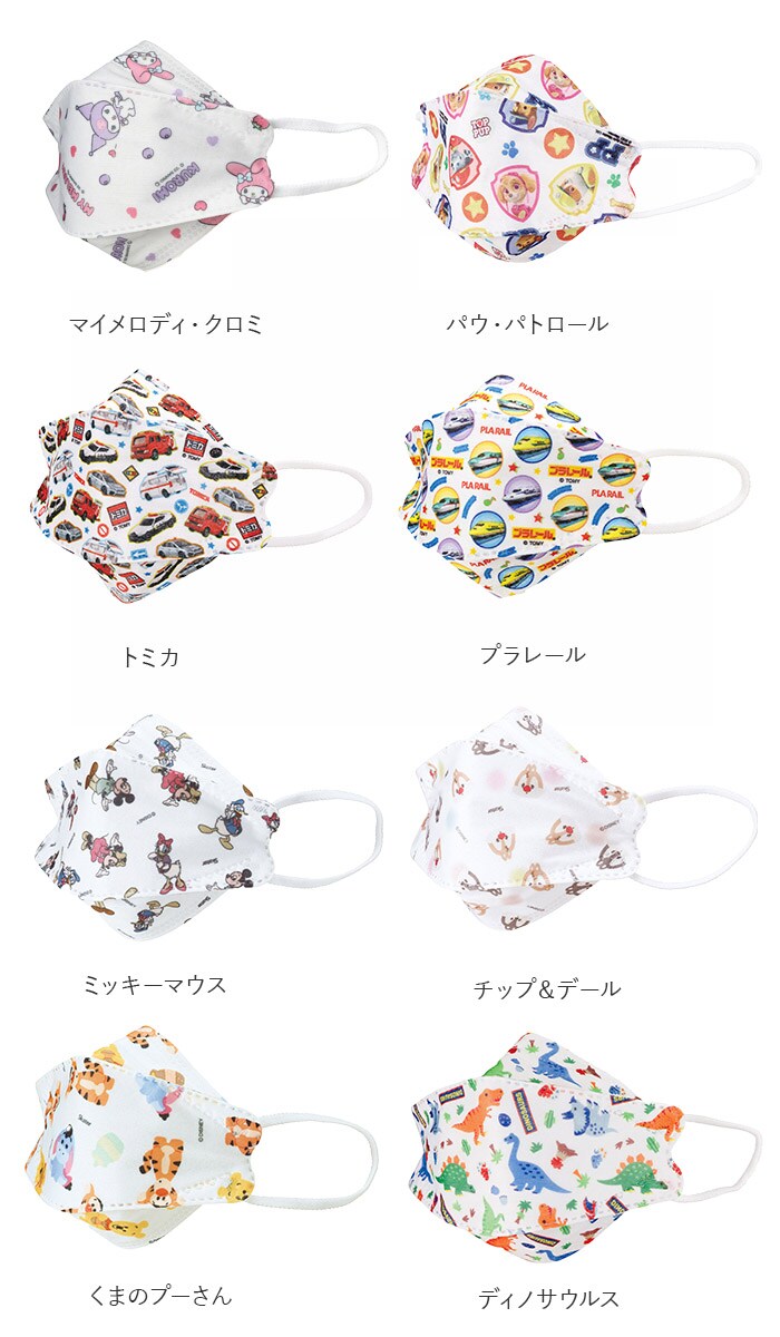 | 注意点 | [対象年齢]4才以上[対象]風邪・花粉・ほこり等本品は有害な粉塵やガス等の発生する場所でのご使用はできません。マスクが濡れた状態でのご使用は絶対にしないでください。火のそばでのご使用はできません。機能性の維持、衛生面から1日1枚のご使用をお勧めします。本品は使い切り商品です。洗濯による再使用はできません。万一、かゆみ・かぶれ・耳が痛くなる等の症状があらわれた場合は直ちにご使用をやめ、医師にご相談ください。マスクの耳ひもを首にかけてふざけたり、乱暴に遊ばないでください。窒息などの危険があります。耳ひもを引っ張りすぎると切れるおそれがありますのでご注意ください。万一臭いにより気分が悪くなった場合はご使用をおやめください。睡眠時のご使用はおやめください。マスクが触れる部位に傷や炎症がある場合は悪化することがありますので、ご使用はお避けください。小さなお子様の手の届かないところに保管してください。用途以外には使用しないでください。お子様には保護者の方からご使用方法をご説明ください。4才未満、呼吸器に異常がある、着用時に息苦しさを感じる、自分の意志で着脱できない、いずれかに該当するお子様には使用しないでください。カメラやモニターの性質により、画像と実物の色の違いがある場合がございますのでご理解願います。 |