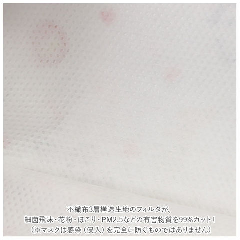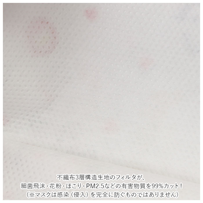 | 注意点 | [対象年齢]4才~[対象]風邪・花粉・ほこり等本品は有害な粉塵やガス等の発生する場所でのご使用はできません。マスクが濡れた状態でのご使用は絶対にしないでください。火のそばでのご使用はできません。機能性の維持、衛生面から1日1枚のご使用をお勧めします。本品は使い切り商品です。洗濯による再使用はできません。万一、かゆみ・かぶれ・耳が痛くなる等の症状があらわれた場合は直ちにご使用をやめ、医師にご相談ください。マスクの耳ひもを首にかけてふざけたり、乱暴に遊ばないでください。窒息などの危険があります。耳ひもを引っ張りすぎると切れるおそれがありますのでご注意ください。万一臭いにより気分が悪くなった場合はご使用をおやめください。睡眠時のご使用はおやめください。マスクが触れる部位に傷や炎症がある場合は悪化することがありますので、ご使用はお避けください。小さなお子様の手の届かないところに保管してください。用途以外には使用しないでください。お子様には保護者の方からご使用方法をご説明ください。4才未満、呼吸器に異常がある、着用時に息苦しさを感じる、自分の意志で着脱できない、いずれかに該当するお子様には使用しないでください。カメラやモニターの性質により、画像と実物の色の違いがある場合がございますのでご理解願います。 |