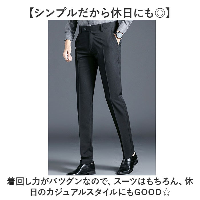 | 商品説明 | 【スラっと美脚シルエット♪】シンプル&ベーシックの使える1枚!「スラックス ビジネスパンツ メンズ」が登場。【ビジネスシーンはこれにお任せ☆】シンプルでいてスタイリッシュに穿きこなせるスラックス。スーツからビジカジまでマッチ。【穿くだけで美脚を叶える♪】センタープレス×ノータックで、よりスッキリと。先細に見せるスリムシルエットがポイント。【イージーケアで毎日ラクラク♪】耐久性に優れ、シワになりにくい素材を使用。通気性が良いので、1日履いても快適さキープ。【便利なポケットつき】両サイドにポケットを搭載。スマホなどの小物を入れられるのでビジネスシーンにもぴったり!【シンプルだから休日にも◎】着回し力がバツグンなので、スーツはもちろん、休日のカジュアルスタイルにもGOOD☆ |