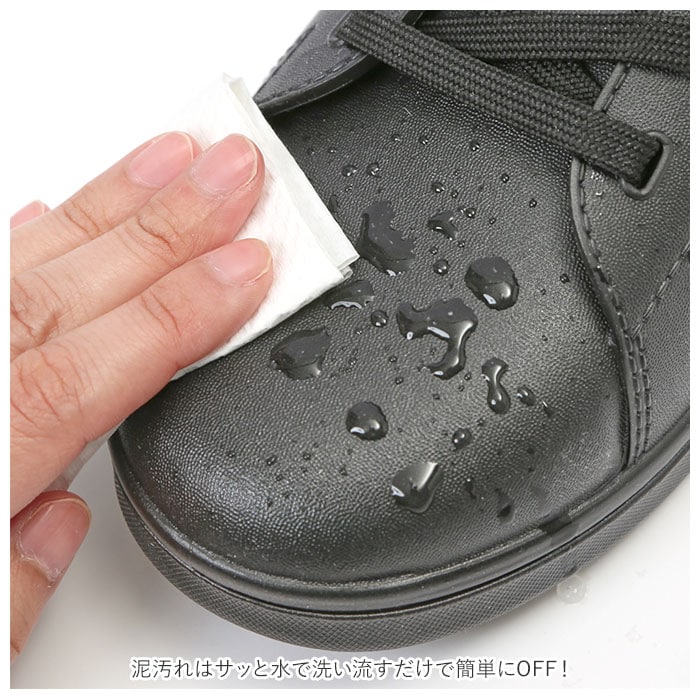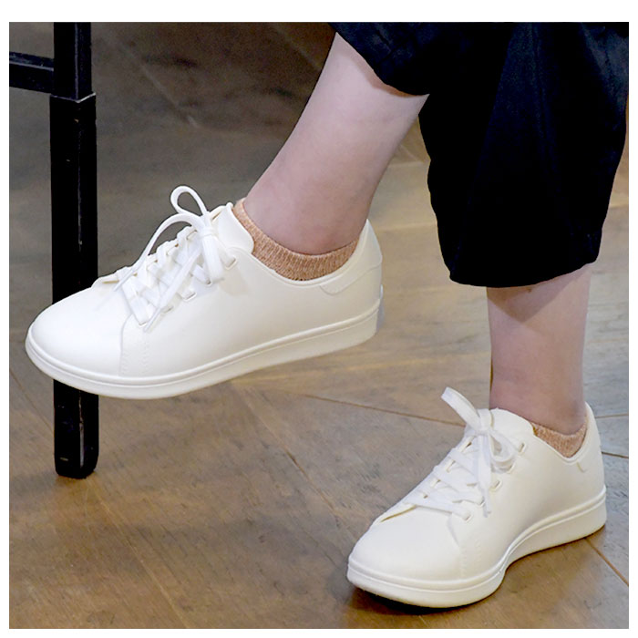 | 商品説明 | 雨の日も晴れの日も足元を素敵に演出!全天候型防水スニーカー「マンダム#59」が新登場。レインシューズに見えないカジュアルなルックスで、「濡れるのは嫌だけど、長靴は野暮ったくて・・・」と思っていたお洒落さんに最適!アウトソールとアッパーは、水濡れに強いPVC素材で一体成型。シュータン部分も内側で繋がっているため、雨の侵入をシャットアウト。泥汚れはサッと水で洗い流すだけで簡単にOFF!クッション性のあるインソールで歩きやすさも抜群。お手入れの際はインソールの取り外しが可能。アウトソールには静電気帯電防止ソールを採用。さらにしっかりと溝の刻まれた靴底で、ぬかるんだ道や湿って滑りやすいフロアーでも抜群のグリップ力。ボディーカラーと同系色のシューレースを合わせたシンプルデザインで、オンでもオフでもコーディネート自在。23cmから28cmまでの幅広いサイズ展開で、男女ともにスタイリッシュに着用できるユニセックスモデル。 |