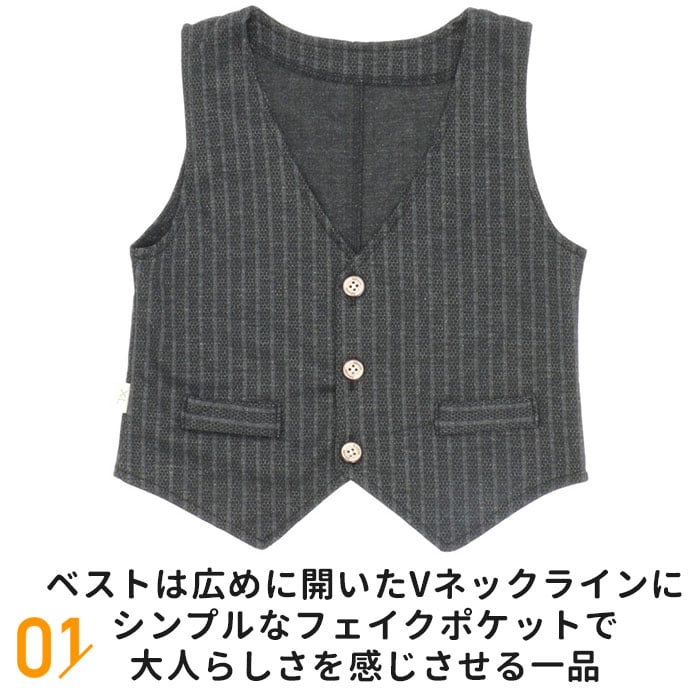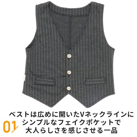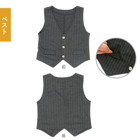 | 商品説明 | 入園式や七五三をカッコ可愛く決める紳士風男の子用フォーマルスーツセットが登場。ジャケット、シャツ、ボトムス、ベスト、ネクタイのお買い得な5点セット。ジャケットは体に沿うようなシルエットでカッコよく決まるデザイン。ハンカチを入れられるポケット2個付き。ベストは広めに開いたVネックラインにシンプルなフェイクポケットで大人らしさを感じさせる一品。ボトムスのウエストはゴム仕様なので快適に過ごせ、着脱もしやすい♪さらにネクタイはワンタッチタイプだからサッと付けられる。 |