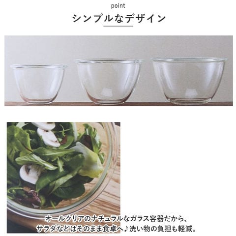 | 商品説明 | 下ごしらえも調理もラクラク。使いやすさにこだわった「HARIO 耐熱ガラス製ボウル3個セット」が新登場。【混ぜやすい深めの形状】混ぜやすさを考えて設計された、深めのつくり。食材が中央に集まるのでまわりに飛び散りにくく、安定感のある厚みもポイント。【便利な耐熱仕様】電子レンジでの温めや、オーブン調理もOK。安心の日本製で、料理の幅が広がるアイテム。【シンプルなデザイン】オールクリアのナチュラルなガラス容器だから、サラダなどはそのまま食卓へ♪洗い物の負担も軽減。【お手入れラクラク】食洗機に対応しているから、忙しい毎日の味方!【スタッキングもできる3個セット】・900ml、1500ml、2200mlの3個セット。食事の下ごしらえやお菓子づくりなど用途に合わせて使い分けでき、径の小さいスタッキング仕様で収納も省スペース。 |