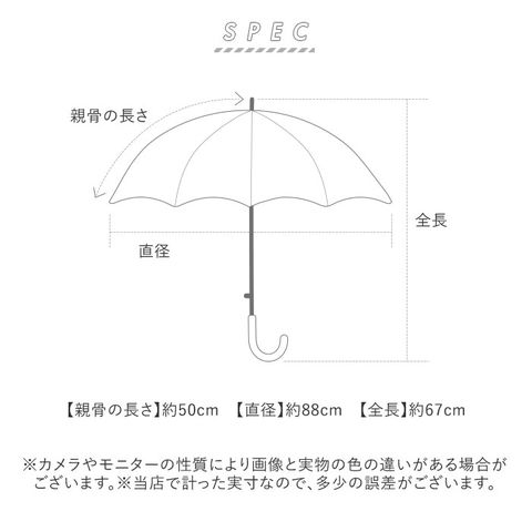 | サイズ | [親骨の長さ]約50cm/[直径]約88cm/[全長]約67cm ※サイズは当店計測の実寸サイズです。実際の商品ならびにメーカー表記サイズとは多少の誤差が生じる場合がございます。あらかじめご了承ください。 |