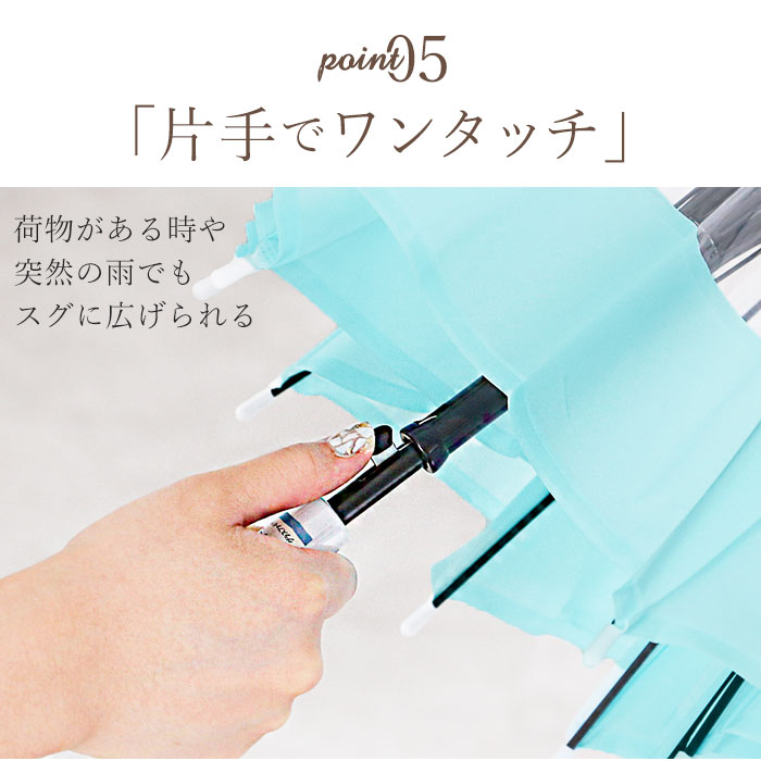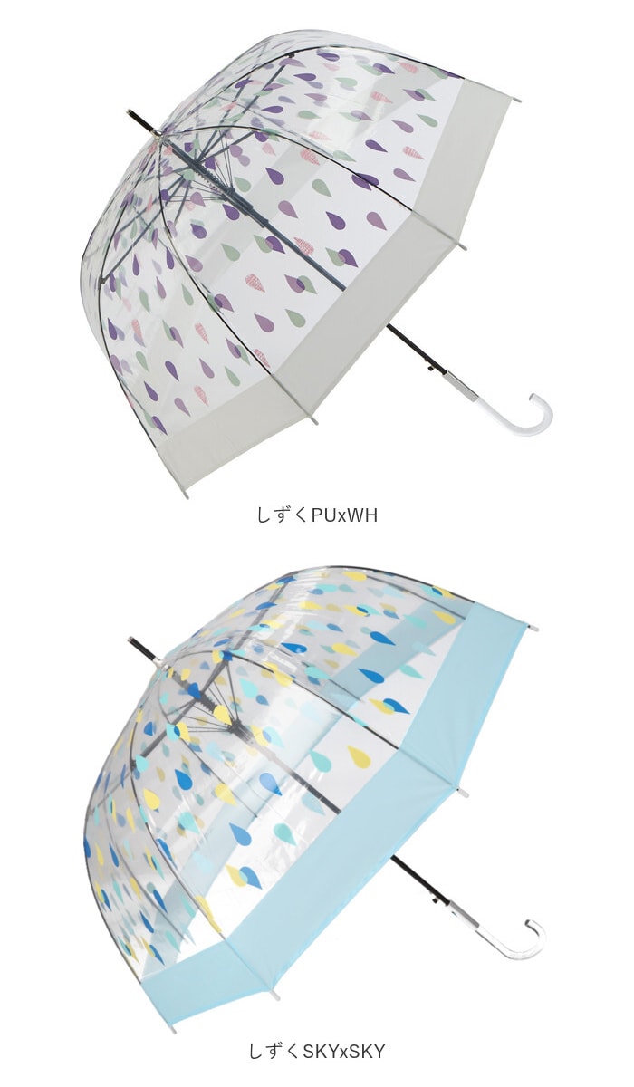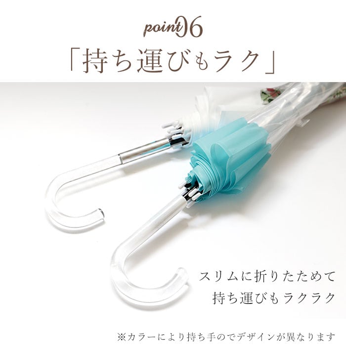 | 注意点 | 本製品に尖った部分があります。周りの人やものにあたらないよう、周囲の安全を確認してからご使用下さい。傘の開閉時やシャフトの伸縮時には、顔や身体から離してご使用下さい。本製品の手元や骨が折れたりした場合には、怪我や事故になる恐れがあるため、使用を中止して下さい。強風の時は、本製品が破損する恐れがありますので使用しないで下さい。本製品をステッキとして使用するなど、傘本来の目的以外での使用は止めて下さい。本製品は、自転車・ベビーカーなどの固定する器具に取り付けて使用する構造になっておりません。視野の妨げ、事故・破損の原因となる恐れがありますので、絶対に取り付けないで下さい。本製品には、構造上、骨同士が狭くなっているので、骨に挟まれたりけがをする恐れがありますので、手や指を入れないで下さい。ハンドクリームや日焼け止めクリーム等が、本製品の生地・手元等の色落ちの原因になる場合があります。ご使用後は、本製品を陰干しにして乾かしてからおしまい下さい。濡れたまま保管しますと、錆の発生や生地の色移りの原因となる場合があります。お子様がお使いの際には、保護者の方のご指導の上でご使用下さい。カメラやモニターの性質により、画像と実物の色の違いがある場合がございますのでご理解願います。 |