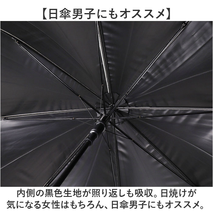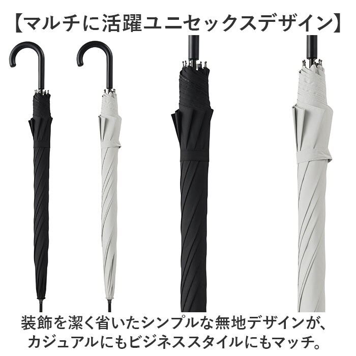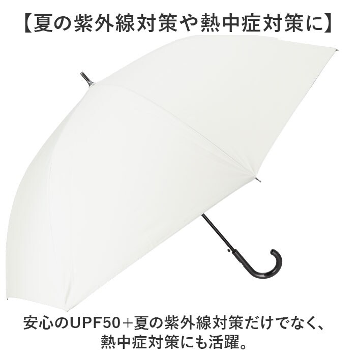 商品説明【マルチに使えるユニセックスデザイン】装飾を潔く省いたシンプルな無地デザインで、雨の日も晴れの日もおまかせの長傘が登場。【強い日射しや熱から紫外線をカット】紫外線遮蔽率99%以上、遮光率99.9%以上で気になるシミ予防から暑さを防ぐ遮熱効果も。【傘の下はまるで木陰のような涼しさ】内側をブラックコーティングにすることで、反射光をブロックし、木陰のような涼しさ。【夏の紫外線対策や熱中症対策に】安心のUPF50+夏の紫外線対策だけでなく、熱中症対策にも活躍。【大判サイズで男性にもおススメ】親骨約65cm、直径約112cmとワイドサイズ。男性の方でもすっぽりカバーできるサイズ感【片手で簡単・ワンタッチ】片手に荷物がある時でもワンタッチで傘生地がパッと広がるジャンプ式タイプ。【マルチに活躍ユニセックスデザイン】装飾を潔く省いたシンプルな無地デザインが、カジュアルにもビジネススタイルにもマッチ。【日傘男子にもオススメ】内側の黒色生地が照り返しも吸収。日焼けが気になる女性はもちろん、日傘男子にもオススメ。【スナップボタンタイプ】傘生地がスムーズにまとまる、スナップボタンタイプの留めバンドを採用。