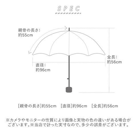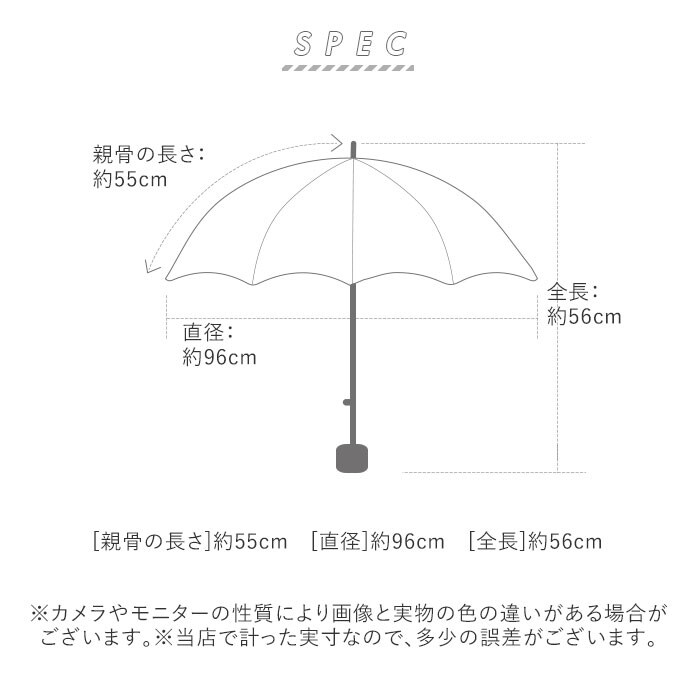 | サイズ | [親骨の長さ]約55cm/[直径]約96cm/[全長]約56cm [収納時の長さ]約24cm [収納時の幅]約7cm ※サイズは当店計測の実寸サイズです。実際の商品ならびにメーカー表記サイズとは多少の誤差が生じる場合がございます。あらかじめご了承ください。 |