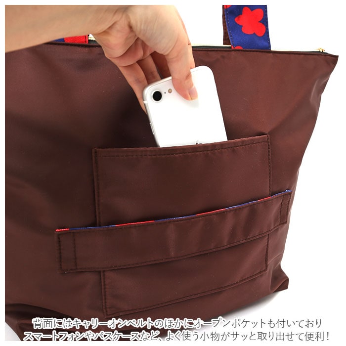 | 商品説明 | ロングスカート柄が個性的な「mis zapatos(ミスサパト)」からキャリーオン付きのトートバッグが新登場♪メイン収納開口部はファスナーで開閉するタイプなので、中身が飛び出さず安心♪A4サイズだから荷物もたくさん入り、小物を仕分けて入れられるオープンポケット×2も装備。背面にはキャリーオンベルトのほかにオープンポケットも付いておりスマートフォンやパスケースなど、よく使う小物がサッと取り出せて便利!ロングスカートと同じカラーと花模様の持ち手がより可愛いアクセントに◎旅行や出張時のサブバッグとして、デイリーユースとしてもマルチに活躍♪ |
