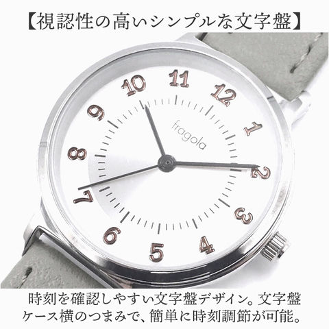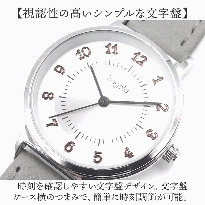 | 商品説明 | 【デイリーに活躍する相棒】普段のお出かけにも気兼ねなく♪「fragola カジュアルケースウォッチ」。【手軽に使える日常生活防水タイプ】うれしい3気圧の日常生活防水仕様。洗顔時・小雨などに一時的に濡れる程度なら大丈夫。(※)水仕事中、プールやお風呂場などでのご使用は故障の原因となるため、お控えください。【視認性の高いシンプルな文字盤】時刻を確認しやすい文字盤デザイン。文字盤ケース横のつまみで、簡単に時刻調節が可能。【安心の日本製ムーブメントを採用】ムーブメントは高い性能を誇る日本製。1秒ごとに時を刻むステップ秒針。【カジュアルコーデに素敵にマッチ】合皮のベルトを使った、落ち着きのあるデザイン。ラフに身につけられる、ユニセックス仕様◎ |