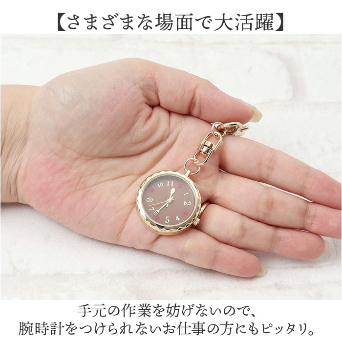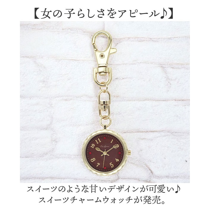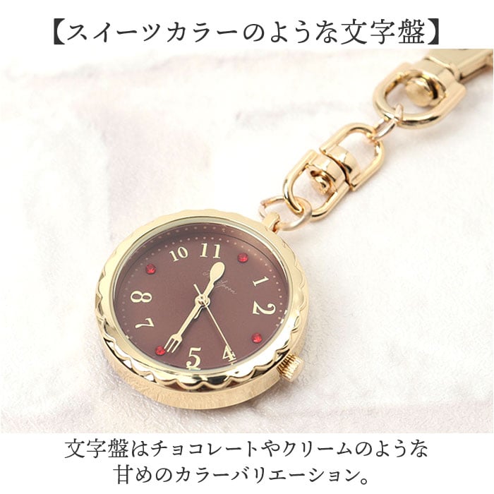 | 商品説明 | 【女の子らしさをアピール♪】スイーツのような甘いデザインが可愛い♪スイーツチャームウォッチが発売。【スイーツカラーのような文字盤】文字盤はチョコレートやクリームのような甘めのカラーバリエーション。【カトラリーモチーフの時計針】時計の針はティースプーンとフォークのモチーフで細かいところまでこだわったデザイン。【赤いビジューストーン付き】いちごのように真っ赤なビジューストーンを文字盤に配置。キラッと輝くアクセントに。【ゴールドパーツで上品さを】各パーツや金具はゴールドカラーを採用し、ラフ過ず上品さもアリ◎【日本製ムーブメント】静かに正確な時を刻む。確かな性能を誇る、安心と信頼の日本製ムーブメントを採用。【アクセサリ感覚でハンギング】フックでバッグやパンツのベルトループ、洋服やポーチにもハンギングが可能!【さまざまな場面で大活躍】手元の作業を妨げないので、腕時計をつけられないお仕事の方にもピッタリ。 |