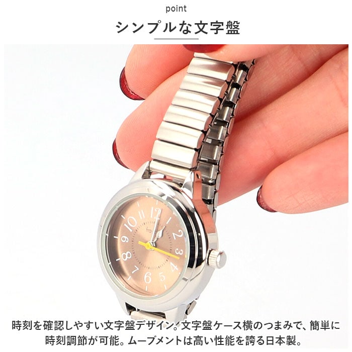 | 商品説明 | サッと着脱OK。シンプルなデザインでシーンを選ばず使える「fragola 10気圧ジャバラウォッチ」が新登場。【アクセサリーのような腕時計】ベルトや文字盤ケースは、マットな質感のシルバーカラー。ブレスレット感覚で身につけられて、学生さんにもおすすめ。【着脱ラクチン】ゴムのように伸びる「ジャバラベルト」で、誰でも簡単に装着OK!【日常強化防水】安心の10気圧防水(日常強化防水)仕様。手洗いや水仕事で水がかかっても大丈夫。(※プールや海でのご使用は故障の原因となるため、お控えください。)【シンプルな文字盤】時刻を確認しやすい文字盤デザイン。文字盤ケース横のつまみで、簡単に時刻調節が可能。ムーブメントは高い性能を誇る日本製。【落ち着きのある仕上がり】オン・オフ問わず身に着けやすいデザインが魅力。お気に入りの文字盤カラーをチョイスして♪ |
