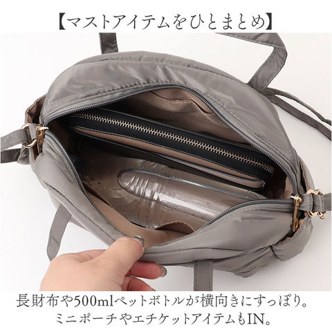 | 商品説明 | 【整理整頓しやすく身軽にお出かけ】コンパクトながらポケット多数◎「ナイロンボンディング 2WAYショルダートート」。【色んなスタイルに素敵にマッチ】角のない丸みを帯びたフォルムに、ふんわりボンディング加工。キレイめにもカジュアルにも☆【かさばりにくくマルチに活躍】程よい収納力を確保しつつ、人混みでも邪魔にならない厚み。アクティブシーンでも重宝。【軽やかな使い心地でノンストレス】約220gほどの軽量なつくり。持ち手もショルダーも細めに設計され、体への負担を軽減。【お好みに合わせてスタイルチェンジ】ハンドバッグとして。長さ調節可能なショルダーを使って、肩掛けや斜め掛けも自在な2WAY!【ガバっと開くダブルファスナー】左右どちらからもオープン!取り出しやすく、ファスナーを閉じればプライバシーを確保。【マストアイテムをひとまとめ】長財布や500mlペットボトルが横向きにすっぽり。ミニポーチやエチケットアイテムもIN。【充実のポケット仕様で迷子知らず】合計8個のポケット。前面とサイドはダーツ使いで立体的に作り、容量アップ&出し入れも簡単。【サスティナブルなバッグ♪】素材の一部には、環境に優しいリサイクル生地を使用。エコにも貢献できるアイテム。【1つあればヘビロテ間違いなし】優しい風合いのデザインとカラーリング。フロントの刺繍タグがアクセント!【ポケット仕様】内側:マグネットポケット×1、オープンポケット×2前面:マグネットポケット×1サイド:オープンポケット×2背面:オープンポケット×2 |