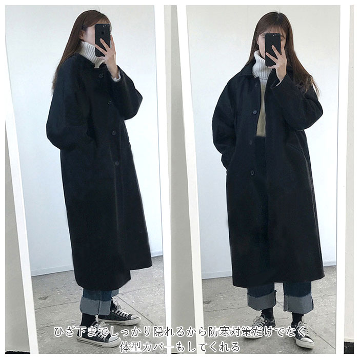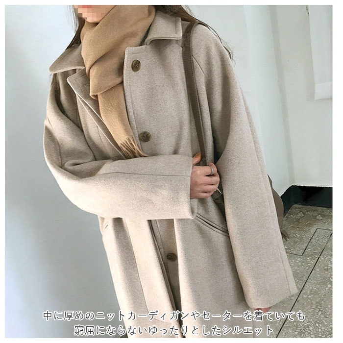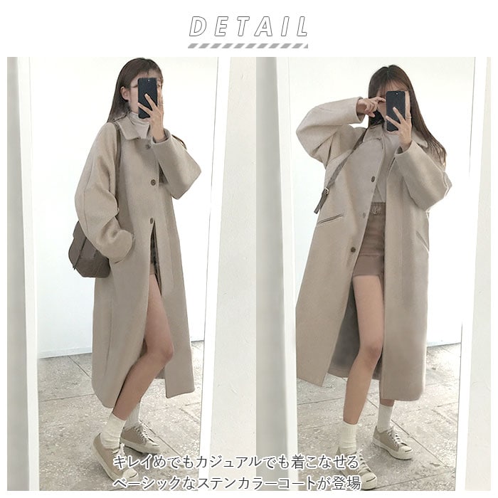 | 商品説明 | キレイめでもカジュアルでも着こなせるベーシックなステンカラーコートが登場。ひざ下までしっかり隠れるから防寒対策だけでなく体型カバーもしてくれる。中に厚めのニットカーディガンやセーターを着ていても窮屈にならないゆったりとしたシルエット。両サイドのポケットはスマホやパスケース、ハンカチなどの小物が入る大きさ。飽きのこないシンプルなデザインだから着まわしやすく長く愛用できる♪ |